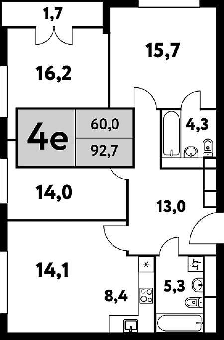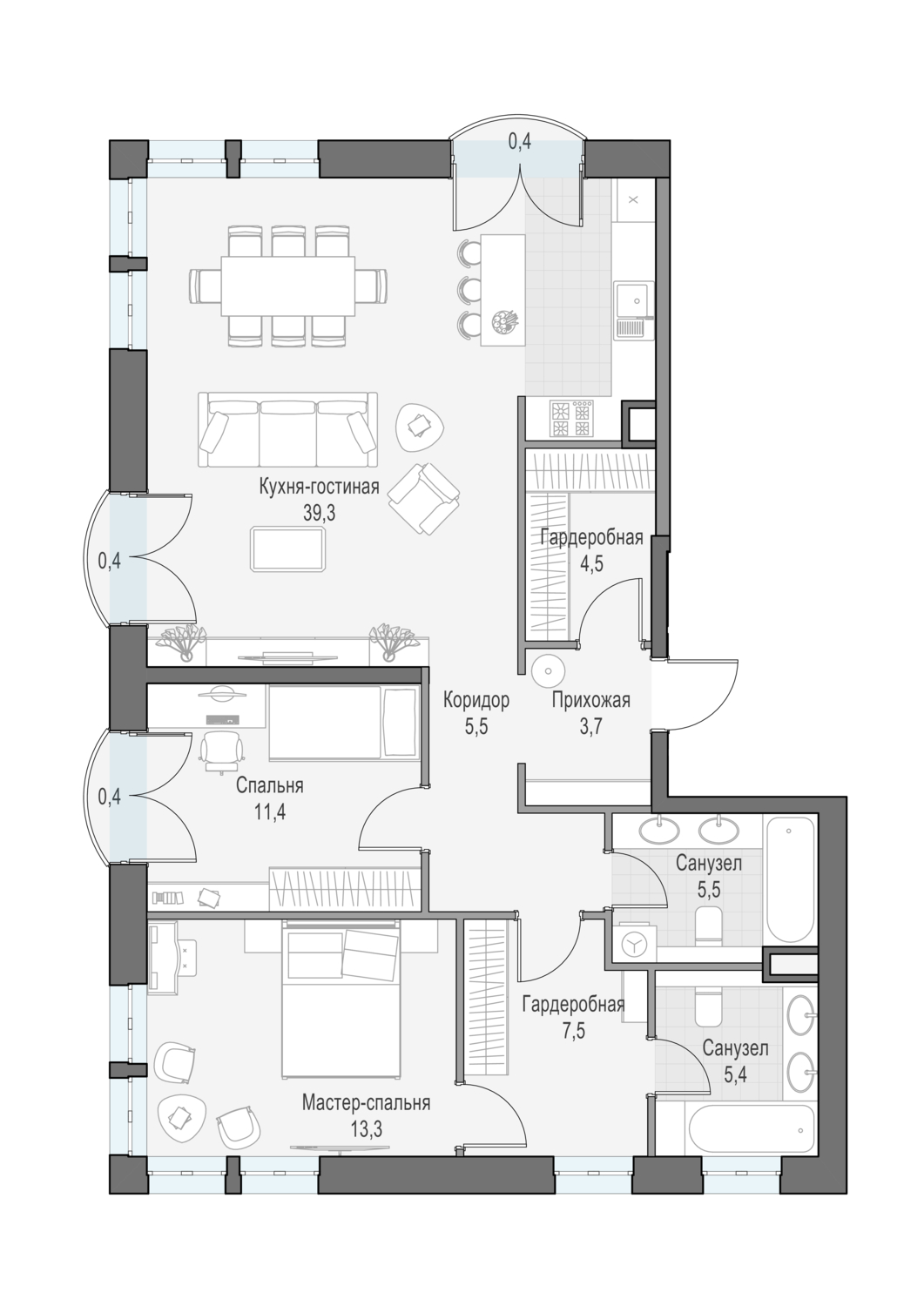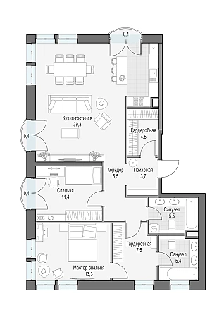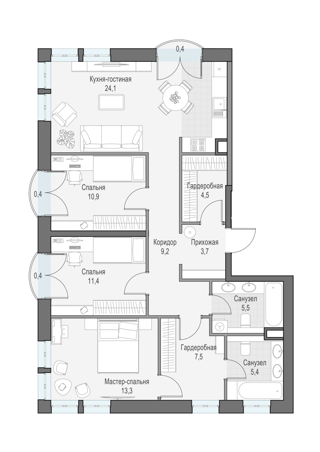 Трёхспальная квартира с просторной кухней-гостиной и мастер-спальней. Окна выходят на восток, север. Мастер – спальня с угловым остеклением на северо-запад.