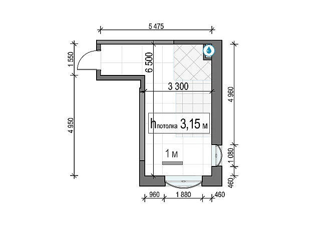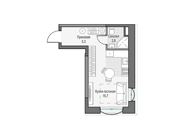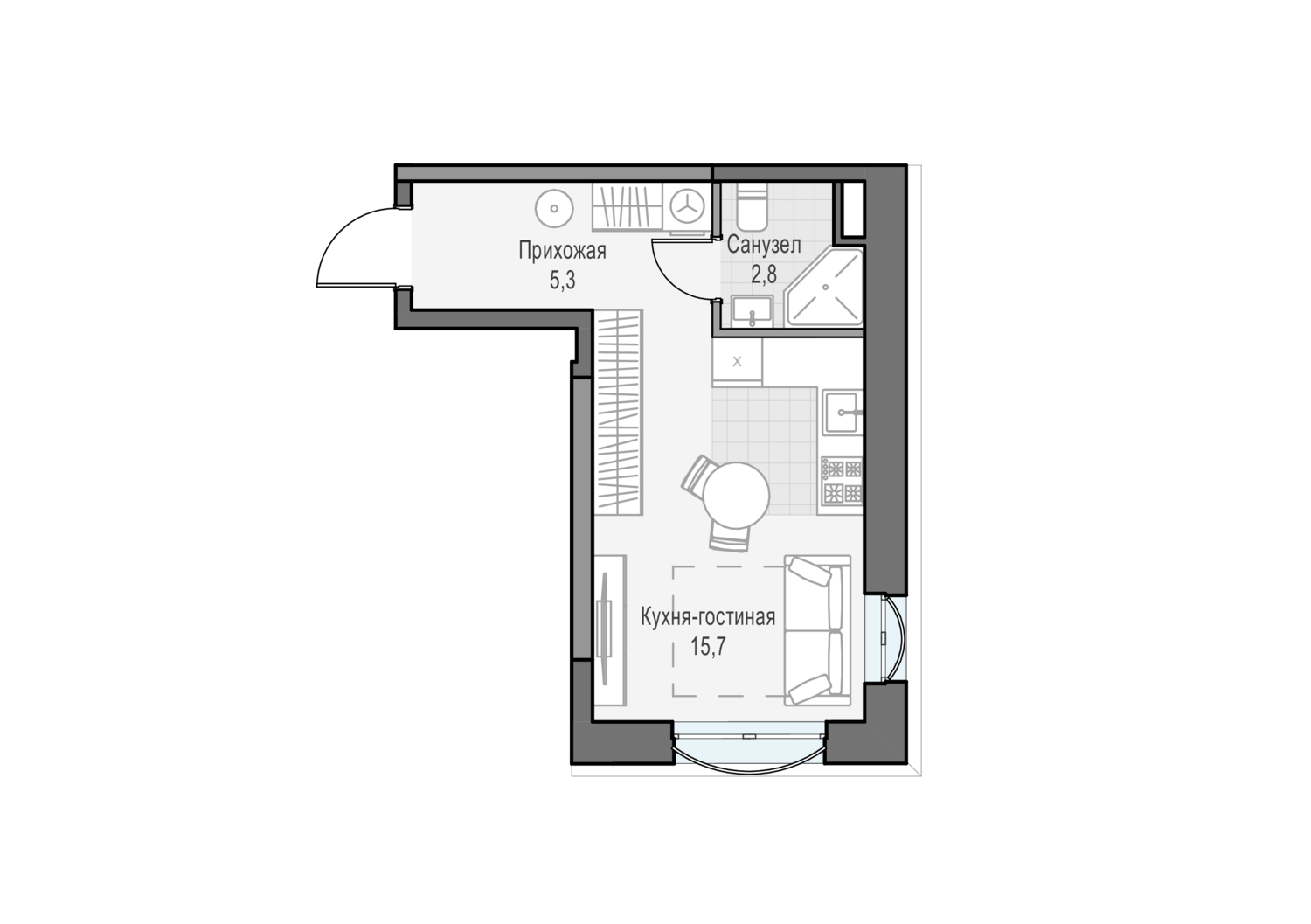 Квартира-студия с двумя окнами. Вид выходит на Запад, в сторону панорамы города.