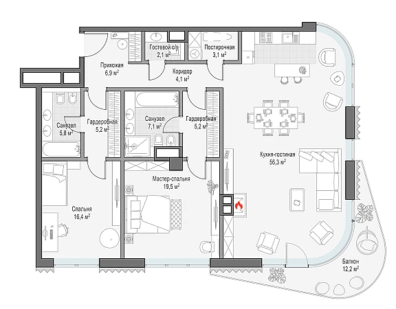 Просторная светлая квартира площадью 135 кв. м с высокими (3,8 метра) потолками. Окна кухни-гостиной обращены в сторону Кремля и выходят в тихий Пыжёвский переулок, а панорамное моллированное остекление и открытый балкон улучшают видовые характеристики пентхауса. Есть возможность установить дровяной камин, который создаст уютную атмосферу загородного дома в центре столицы. Продуманная планировка позволяет разместить две спальные комнаты с отдельными санузлами и гардеробными. Окна пентхауса выходят на восточную и южную стороны.