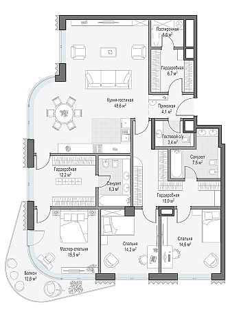 Просторная светлая квартира площадью 154 кв. м с окнами на южной и западной сторонах. Из кухни-гостиной (48 кв. м) открывается вид в направлении Кремля, а панорамное моллированное остекление делает его особенно зрелищным. В квартире есть возможность установить дровяной камин, который создаст уютную атмосферу загородного дома в центре столицы. Продуманная планировка позволяет разместить три спальные комнаты, выходящие окнами в тихий приватный двор-парк с живописным ландшафтным дизайном, фонтаном и ручьём. Мастер-спальня имеет отдельные санузел и просторную гардеробную с окном.