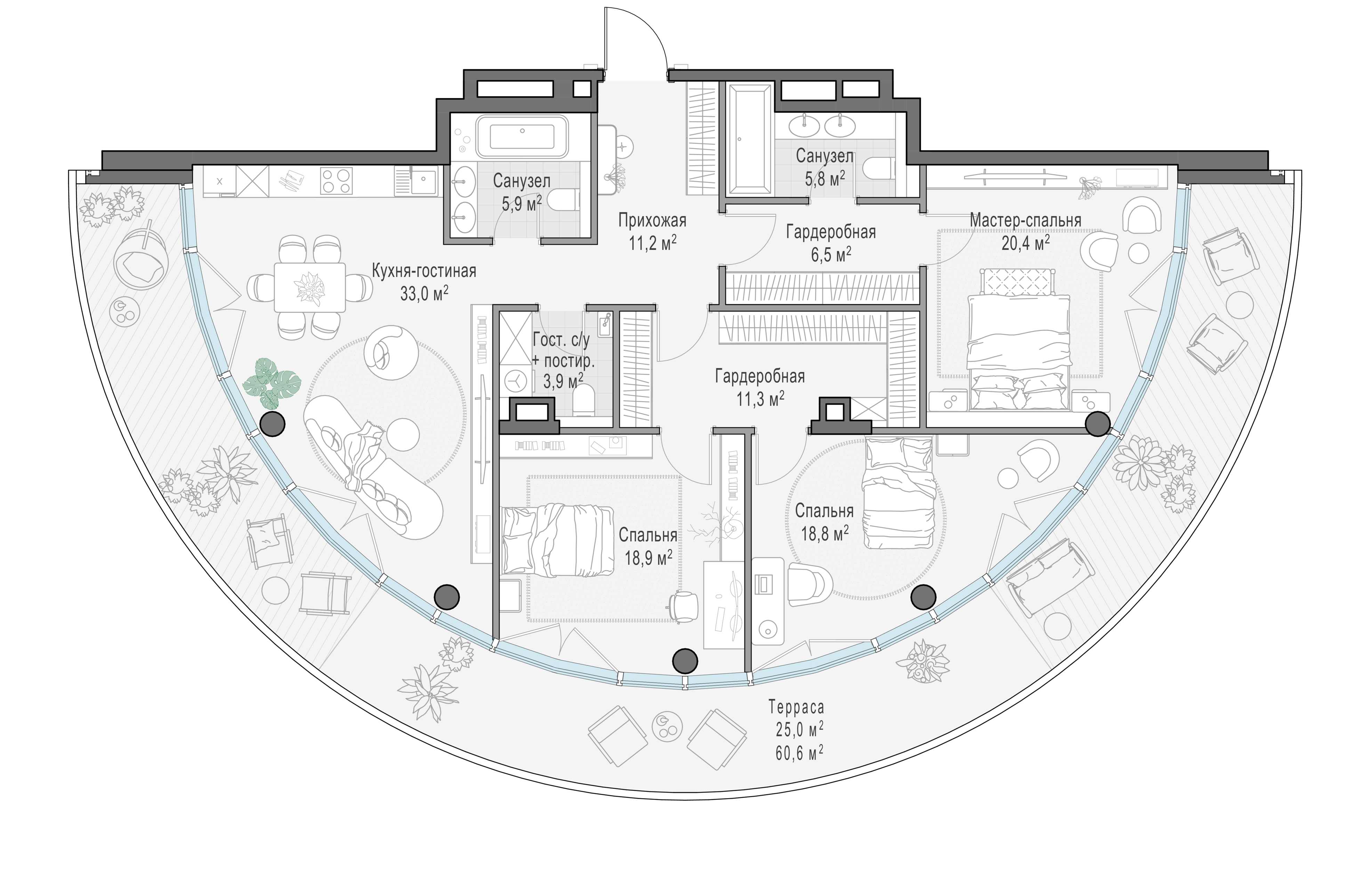 Просторная светлая квартира площадью 156 кв. м с окнами на южной и западной сторонах. В кухне-гостиной (48 кв. м) они обращены в направлении Кремля, а панорамное моллированное остекление улучшает видовые характеристики квартиры. Продуманная планировка позволяет разместить три спальные комнаты, окна которых выходят в тихий приватный двор-парк с живописным ландшафтным дизайном, фонтаном и ручьём. Мастер-спальня имеет отдельные санузел и просторную гардеробную с окном.
