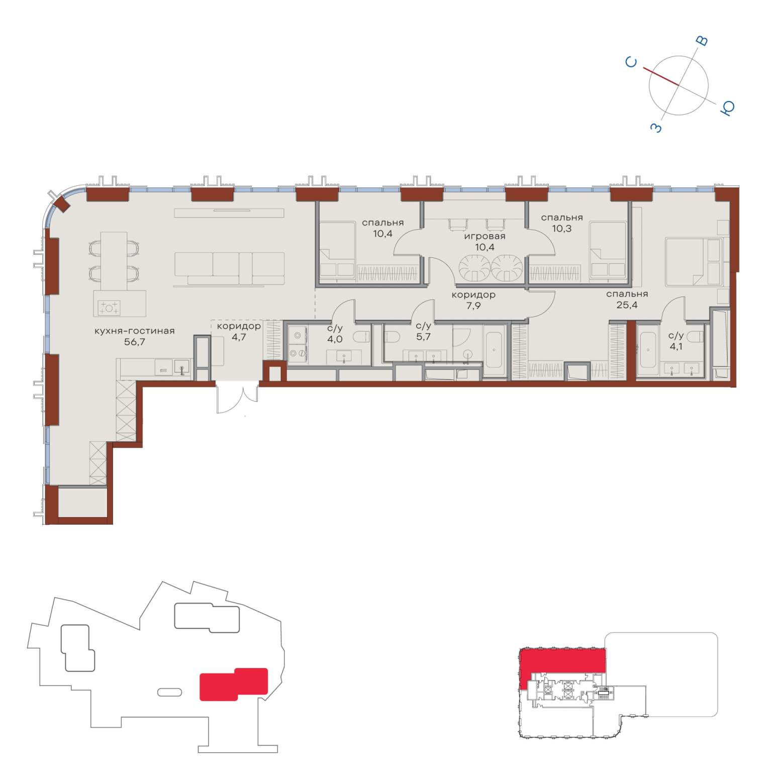 Просторная светлая квартира площадью 154 кв. м с окнами на южной и западной сторонах. В кухне-гостиной (48 кв. м) они обращены в направлении Кремля, а панорамное моллированное остекление улучшает видовые характеристики квартиры. Продуманная планировка позволяет разместить три спальные комнаты. Мастер-спальня имеет отдельные санузел и просторную гардеробную с окном. Из комнат виден тихий приватный двор-парк с живописным ландшафтным дизайном, фонтаном и ручьём.