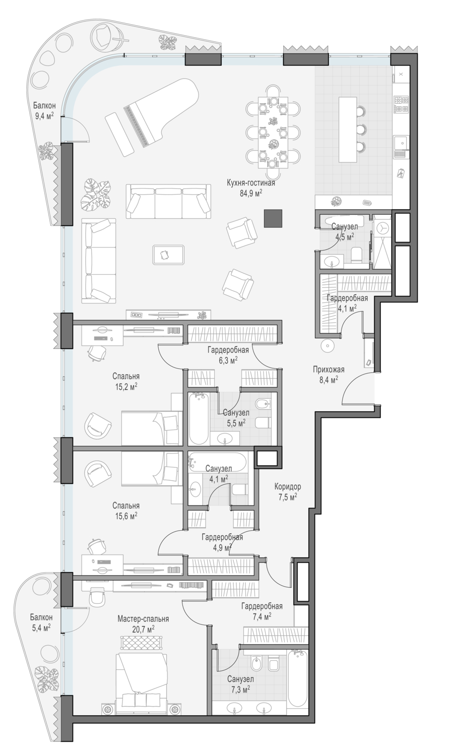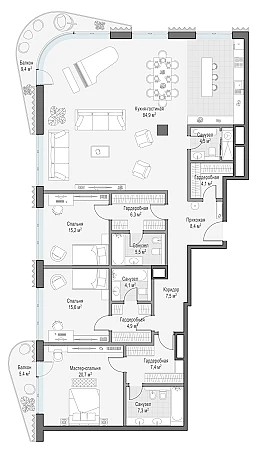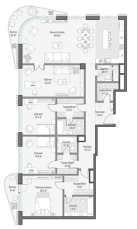 Просторная светлая квартира площадью 199 кв. м с окнами на северной и западной сторонах. В кухне-гостиной (55 кв. м) они обращены в направлении Кремля, а панорамное моллированное остекление и открытые балконы улучшают видовые характеристики квартиры. Продуманная планировка позволяет разместить кабинет и три спальные комнаты с отдельными санузлами и гардеробными, выходящие окнами в тихий приватный двор-парк с живописным ландшафтным дизайном, фонтаном и ручьём.