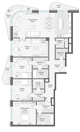 Просторная светлая квартира площадью 200 кв. м с окнами на северной и западной сторонах. В кухне-гостиной (55 кв. м) они обращены в направлении Кремля, а панорамное моллированное остекление и открытые балконы улучшают видовые характеристики квартиры. Продуманная планировка позволяет разместить кабинет и три спальни с отдельными санузлами и гардеробными. Окна комнат выходят в тихий приватный двор-парк с живописным ландшафтным дизайном, фонтаном и ручьём.
