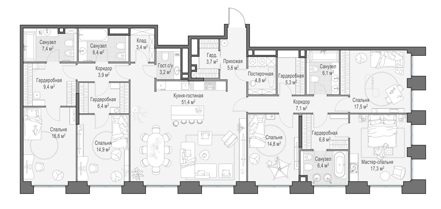 Просторная светлая квартира площадью 171 кв. м с окнами на две стороны. В кухне-гостиной они обращены в направлении Кремля, а панорамное моллированное остекление и открытый балкон улучшают видовые характеристики квартиры. Продуманная планировка позволяет разместить три спальные комнаты с отдельными санузлами и гардеробными, выходящие окнами в тихий приватный двор-парк с ландшафтным дизайном.