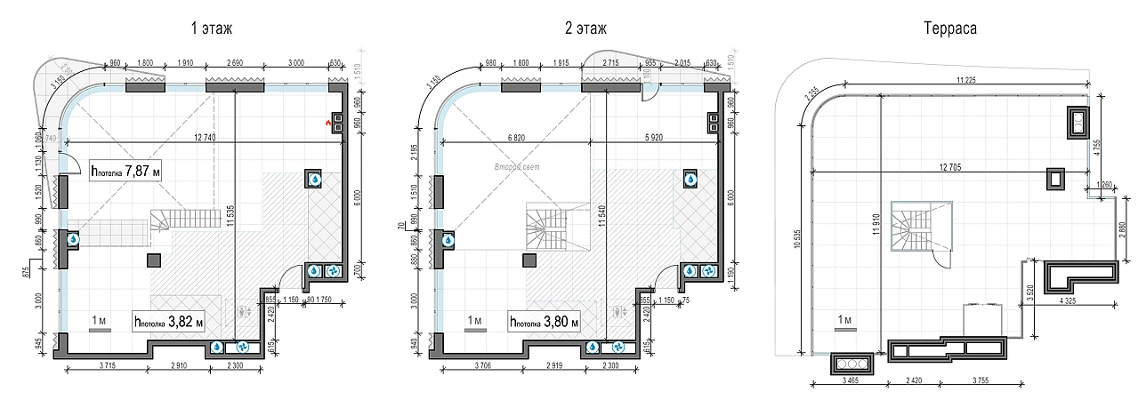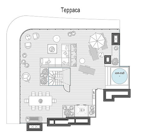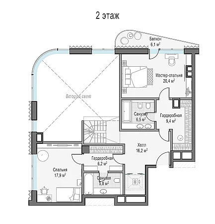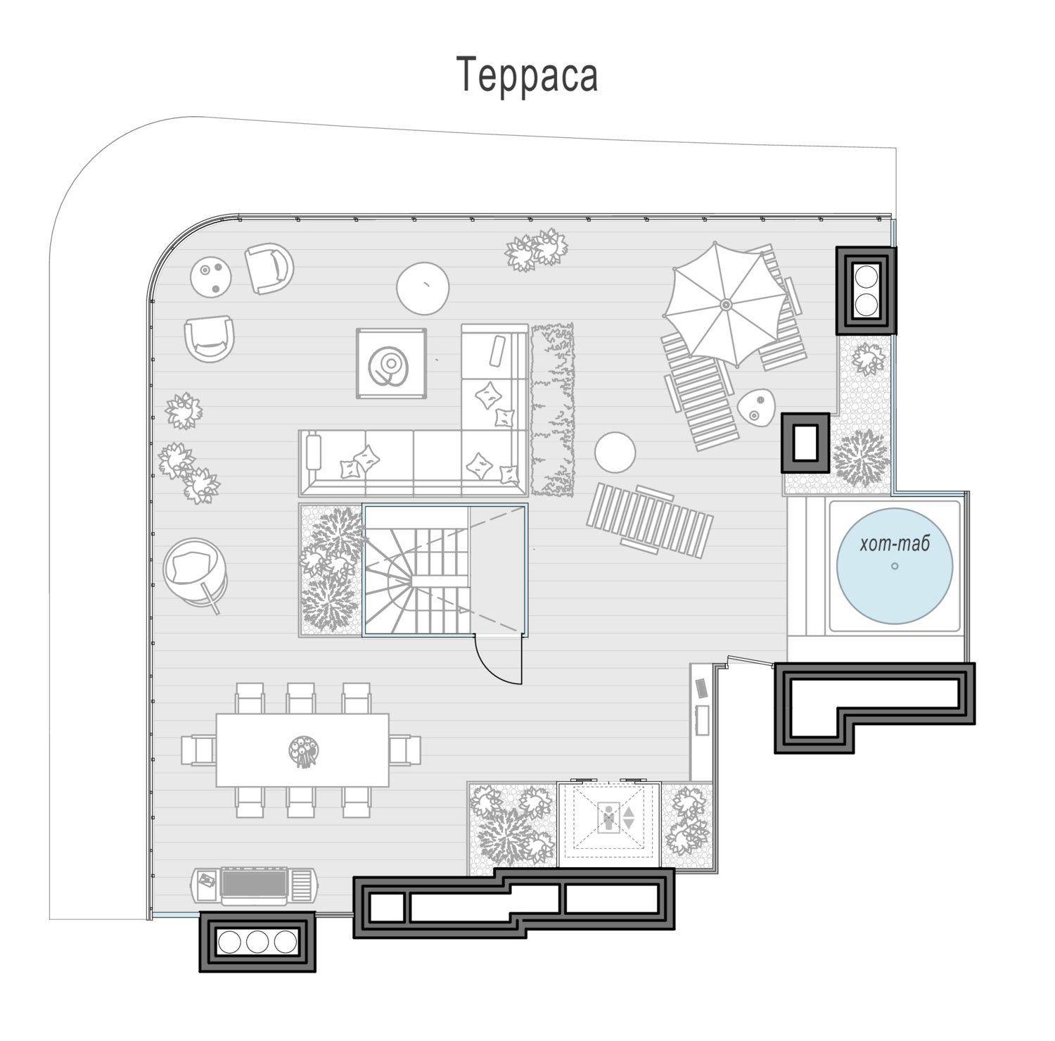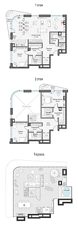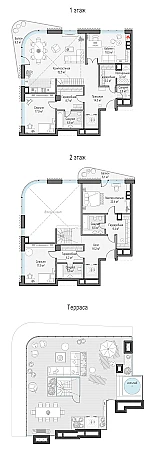 Двухэтажный пентхаус площадью 222 кв. м с террасой (117 кв. м). Просторная кухня-гостиная имеет второй свет, а высота потолка достигает 8 метров. Её окна обращены в сторону храма Христа Спасителя, а моллированное бесшовное остекление улучшает видовые характеристики пентхауса. В гостиной предусмотрен дровяной камин, создающий уютную атмосферу загородного пространства. Три отдельные спальные комнаты преимущественно расположены на втором уровне, а собственная терраса позволяет наслаждаться хорошей погодой не выходя из дома.