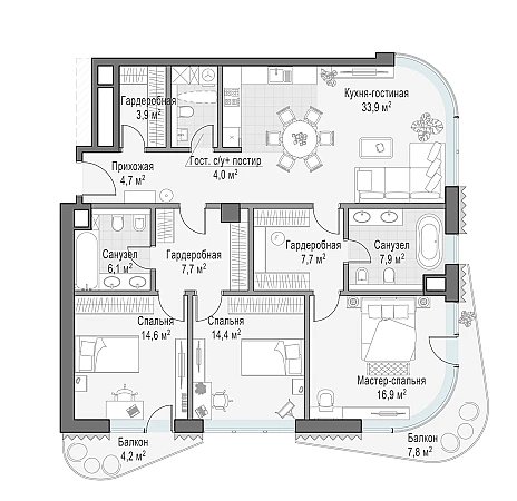 Просторная светлая квартира площадью 125 кв. м с окнами на две стороны . В кухне-гостиной они выходят в живописный внутренний двор и обращены в направлении Кремля, а панорамное моллированное остекление улучшает видовые характеристики квартиры. Продуманная планировка позволяет разместить три спальные комнаты с отдельными гардеробными и санузлами, в одном из которых предусмотрено окно.