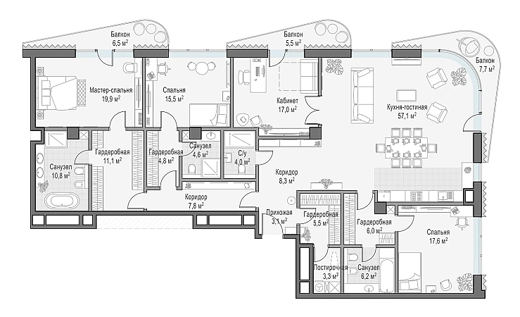 Просторная светлая квартира площадью 208 кв. м. Большинство окон ориентировано в сторону Кремля, а моллированное остекление в уютной кухне-гостиной улучшает видовые характеристики квартиры. Продуманная планировка позволяет разместить четыре приватные спальные комнаты с отдельными гардеробными и санузлами.