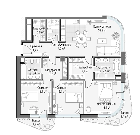 Просторная светлая квартира площадью 125 кв. м с окнами на две стороны . В кухне-гостиной они выходят в живописный внутренний двор и обращены в направлении Кремля, а панорамное моллированное остекление улучшает видовые характеристики квартиры. Продуманная планировка позволяет разместить три спальные комнаты с отдельными гардеробными и санузлами, в одном из которых предусмотрено окно.