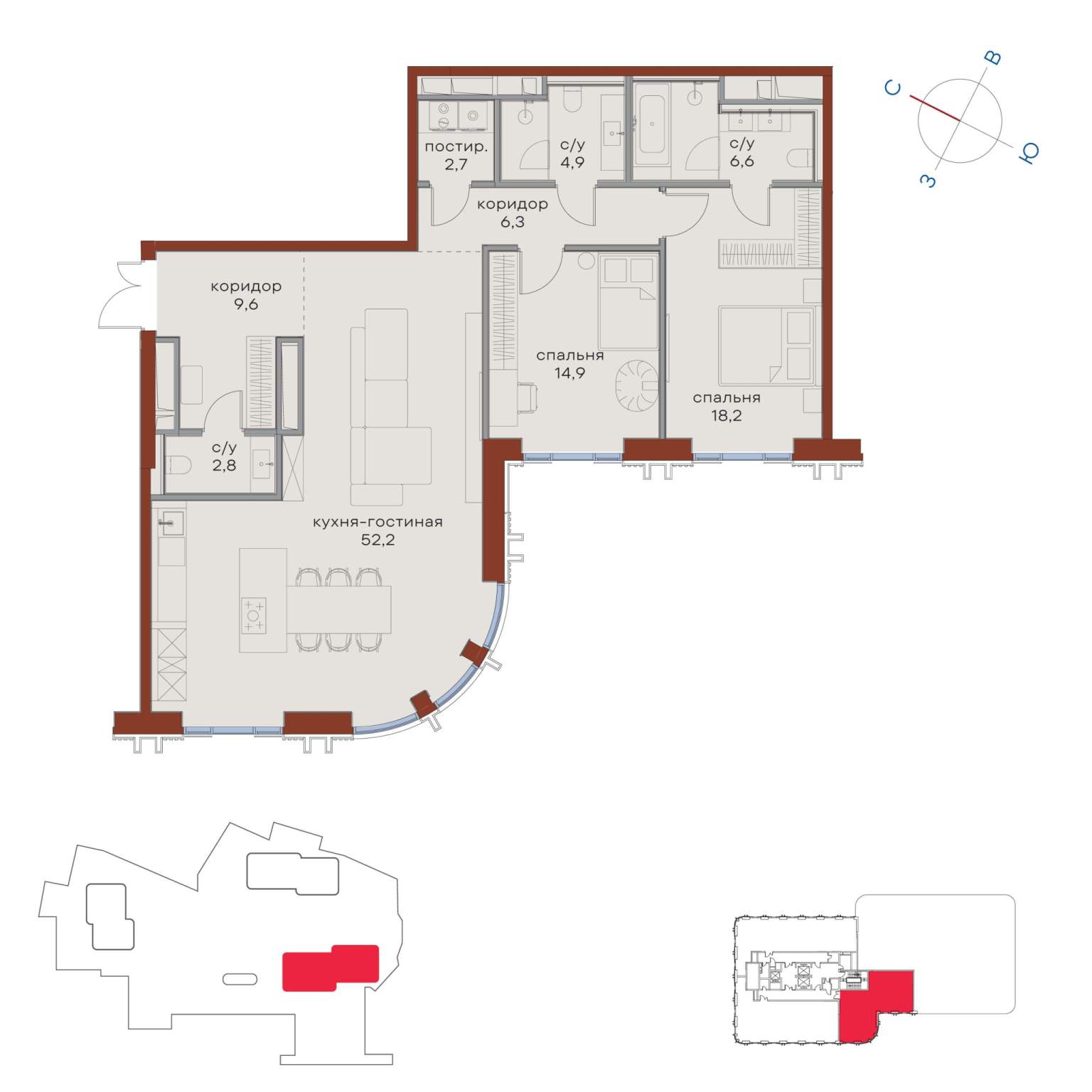 Просторная светлая квартира площадью 112 кв. м с окнами на две стороны . В кухне-гостиной они выходят в живописный внутренний двор, где протекает ручей, а панорамное моллированное остекление улучшает видовые характеристики квартиры. Продуманная планировка позволяет разместить две спальные комнаты с отдельными гардеробными и санузлами, в одном из которых предусмотрено окно.
