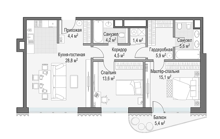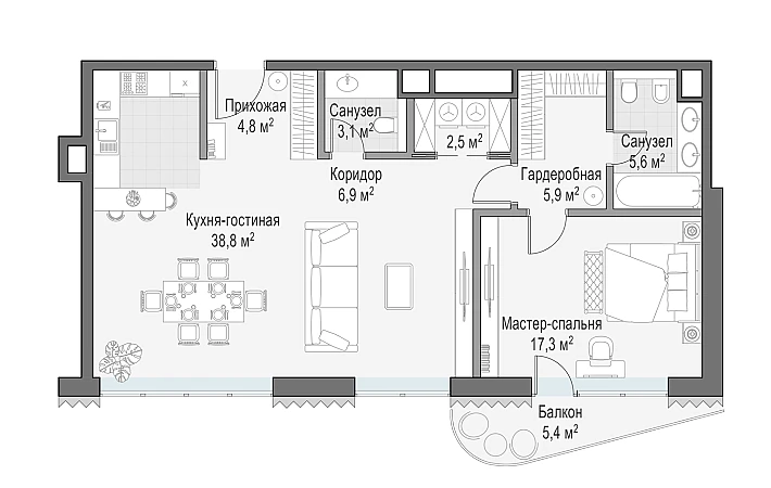 Светлая квартира площадью 85 кв. м с окнами на южной стороне. Продуманная планировка позволяет разместить одну или две отдельные спальные комнаты.
