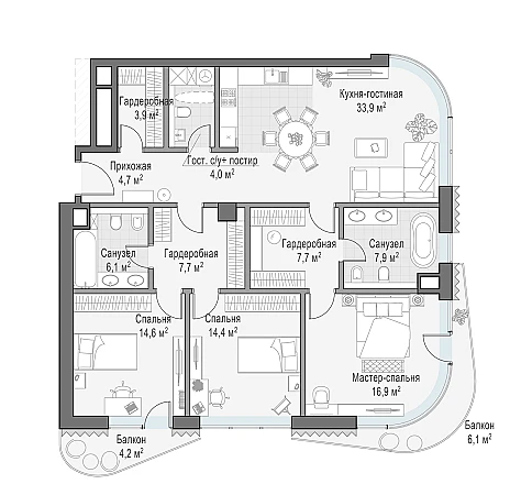 Просторная светлая квартира площадью 125 кв. м с окнами на две стороны . В кухне-гостиной они обращены в направлении Кремля и выходят в живописный внутренний двор, а панорамное моллированное остекление улучшает видовые характеристики квартиры. Продуманная планировка позволяет разместить три спальные комнаты с отдельными гардеробными и санузлами, в одном из которых предусмотрено окно.