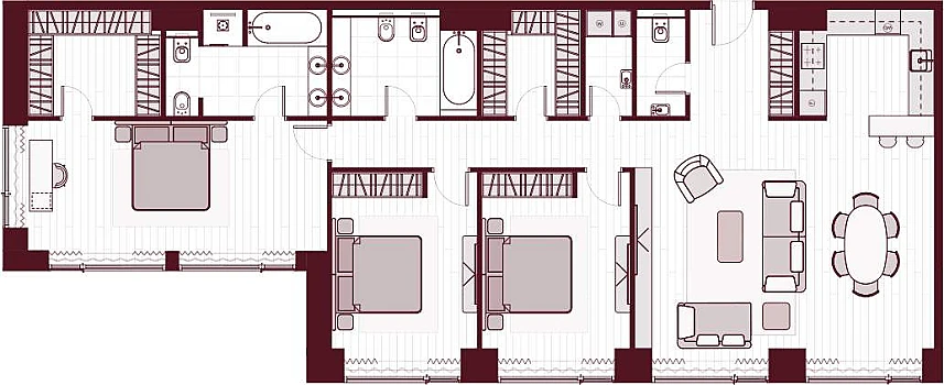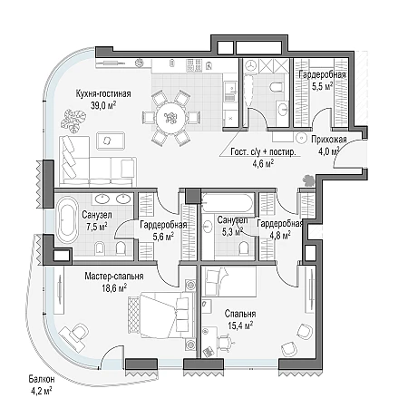 Просторная светлая квартира площадью 111 кв. м с окнами на две стороны . Из кухни-гостиной открывается вид на живописный внутренний двор, где протекает ручей, а панорамное моллированное остекление улучшает видовые характеристики квартиры. Продуманная планировка позволяет разместить две спальные комнаты с отдельными гардеробными и санузлами, в одном из которых предусмотрено окно.