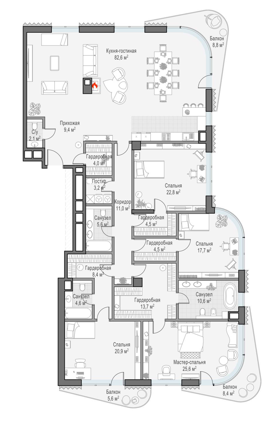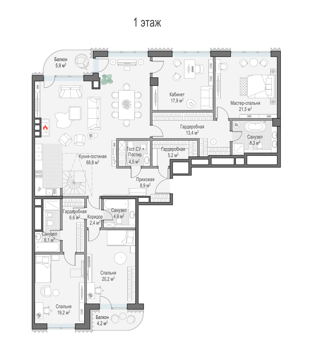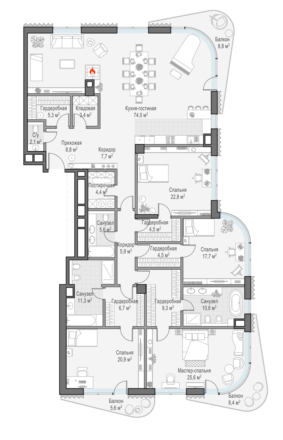 В пентхаусе общей площадью 211 кв. м, расположенном на 8-м этаже, чётко разделены приватная и гостевая зоны, их окна и балконы выходят на противоположные стороны — северную и южную. Панорамное остекление и высокие 4-метровые потолки создают пространство, наполненное светом. Два балкона — и полный простор для фантазии! Дровяной камин в кухне-гостиной создаст уютную и во всех смыслах тёплую атмосферу зимним вечером. Расположенная на крыше личная терраса площадью 148 кв. м с неповторимыми видами на исторический центр столицы подчеркнёт высокий статус владельцев.
