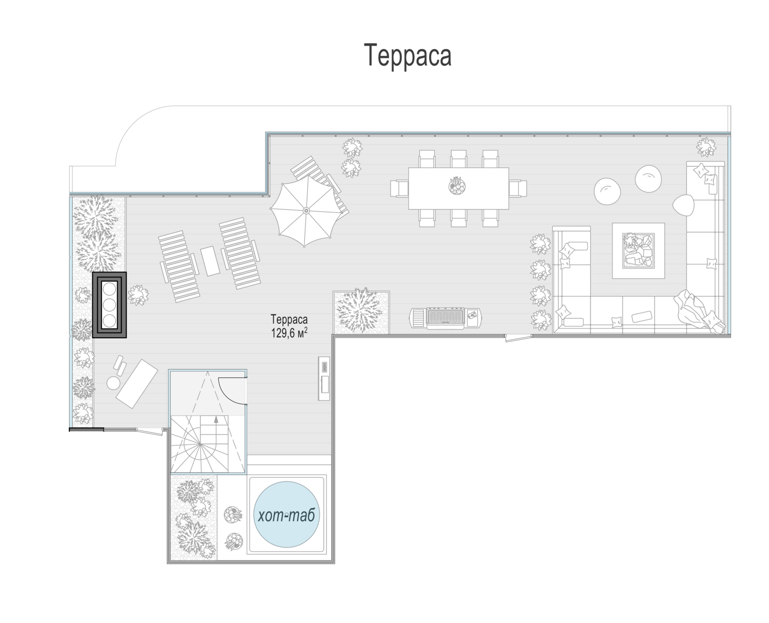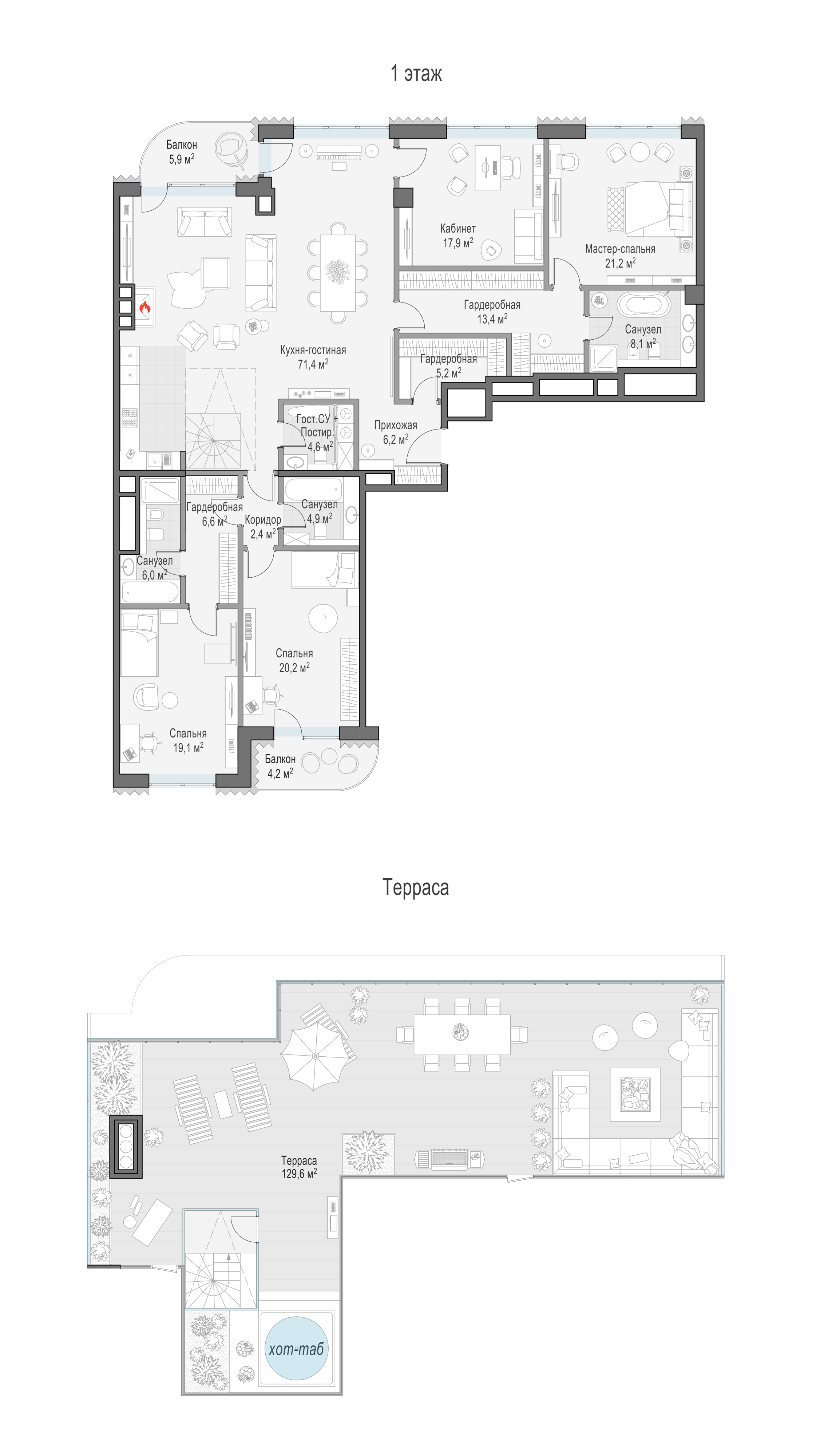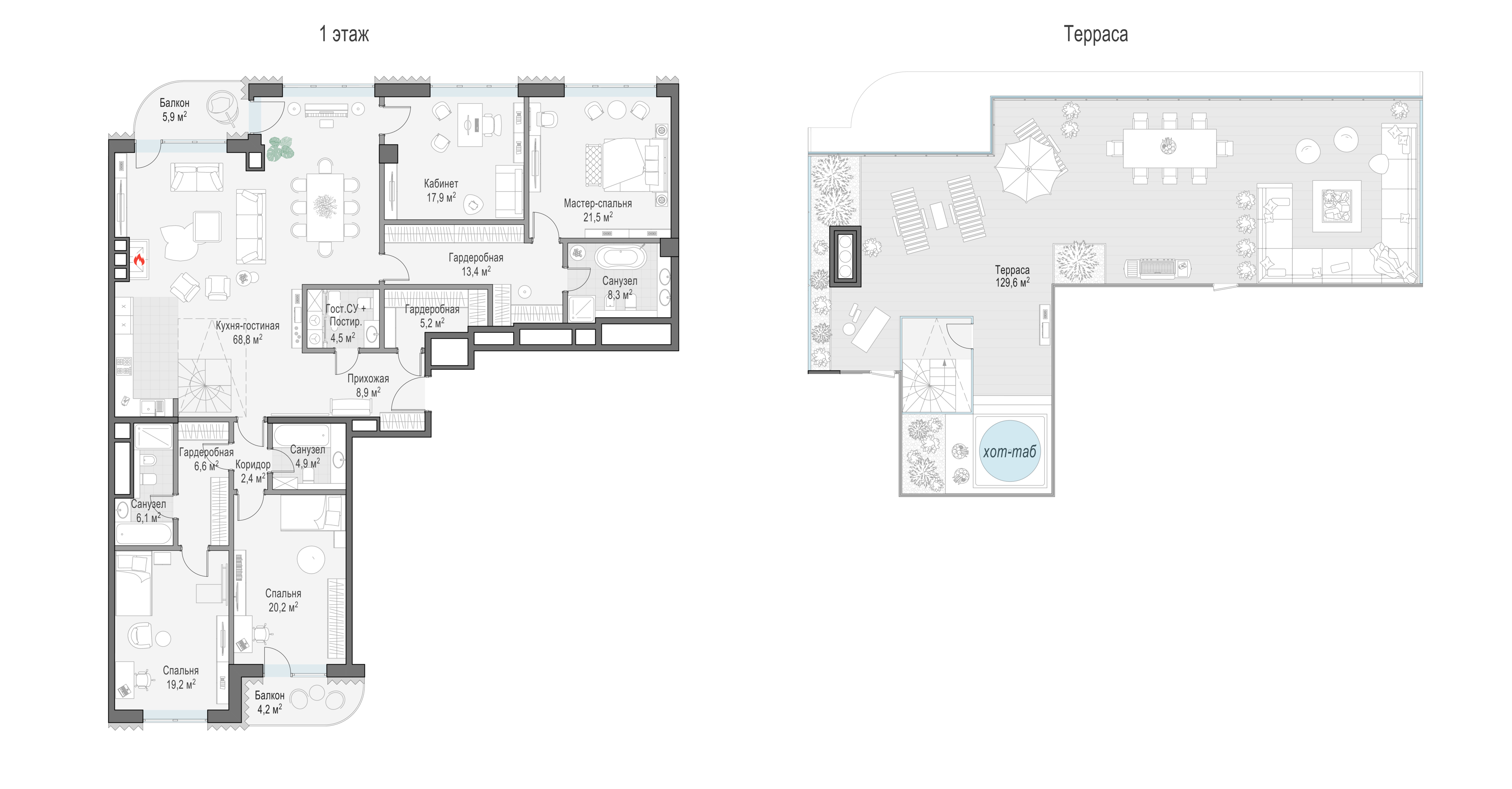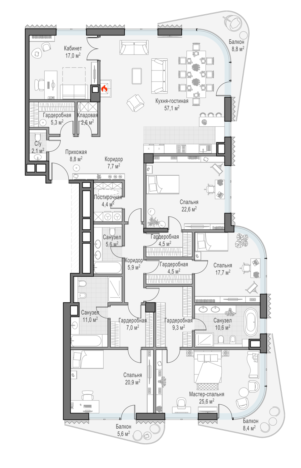 В пентхаусе общей площадью 211 кв. м, расположенном на 8-м этаже, чётко разделены приватная и гостевая зоны, их окна и балконы выходят на противоположные стороны — северную и южную. Панорамное остекление и высокие 4-метровые потолки создают пространство, наполненное светом. Два балкона — и полный простор для фантазии! Дровяной камин в кухне-гостиной создаст уютную и во всех смыслах тёплую атмосферу зимним вечером. Расположенная на крыше личная терраса площадью 148 кв. м с неповторимыми видами на исторический центр столицы подчеркнёт высокий статус владельцев.