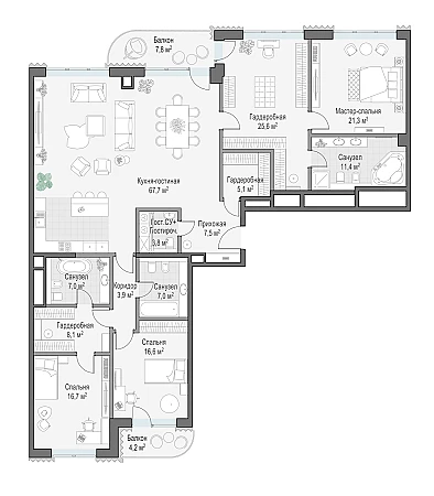 Окна и балконы квартиры выходят на северную и южную стороны. Пространство разделено на общедоступную и приватную зоны — ваши гости непременно оценят это преимущество. Предложение для успешных людей, а также ценителей городских панорам: из квартиры виден исторический центр столицы — створ Лаврушинского переулка, Кремль, храм Христа Спасителя, золотые купола Замоскворечья.