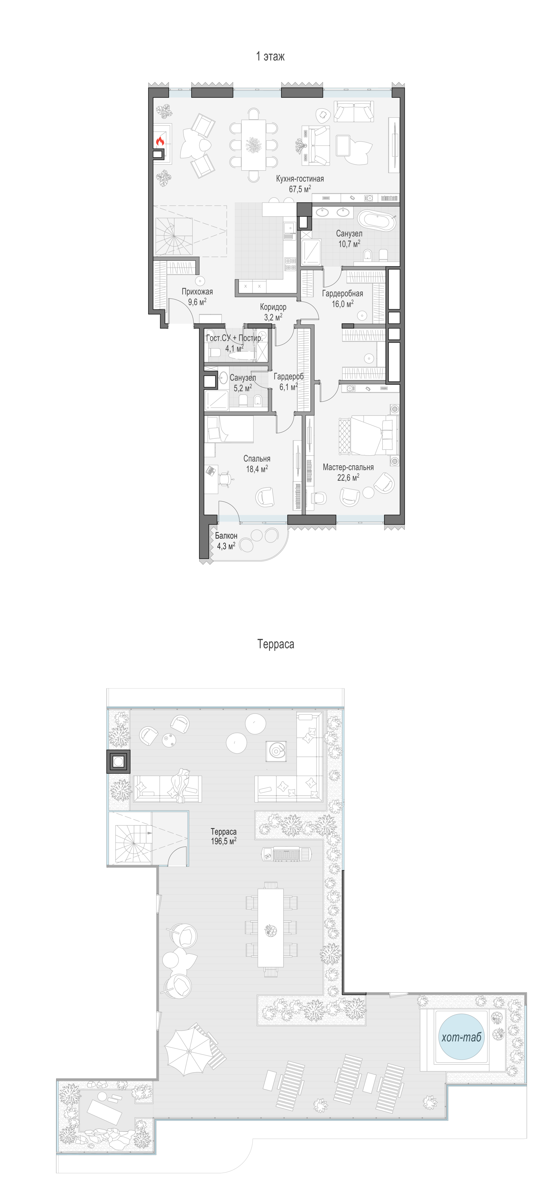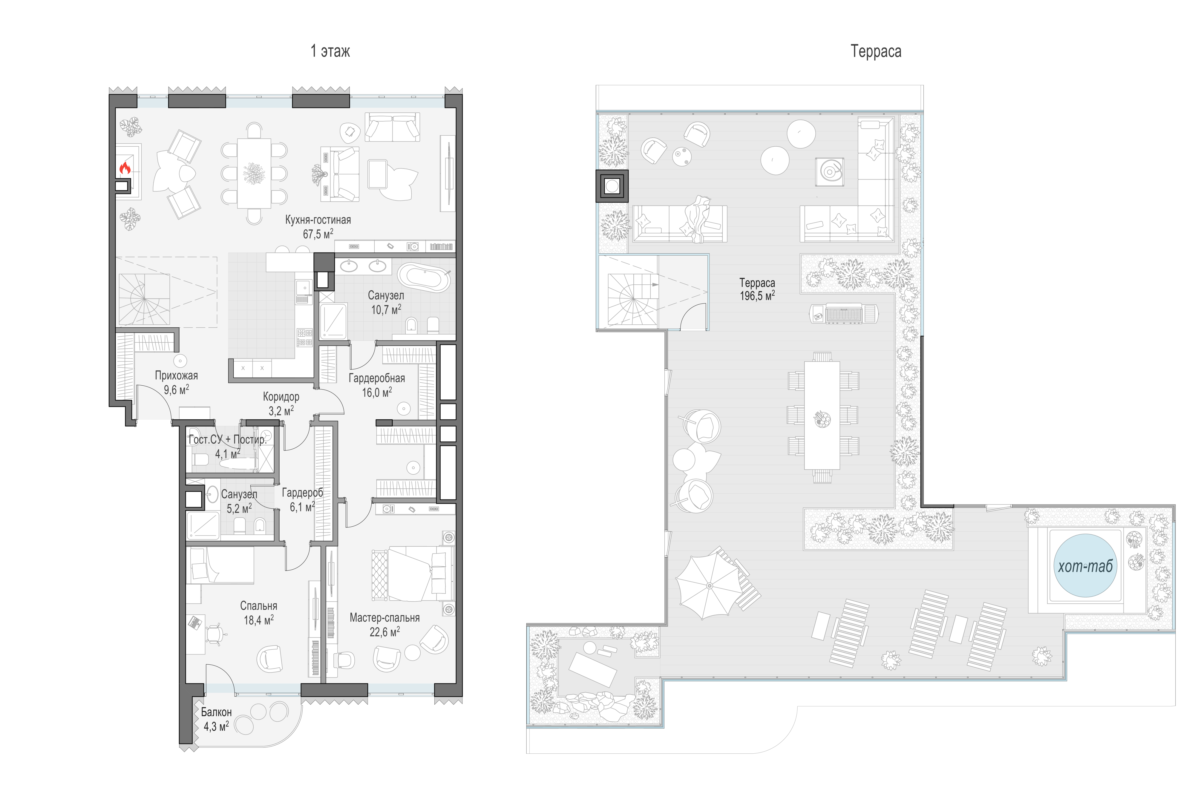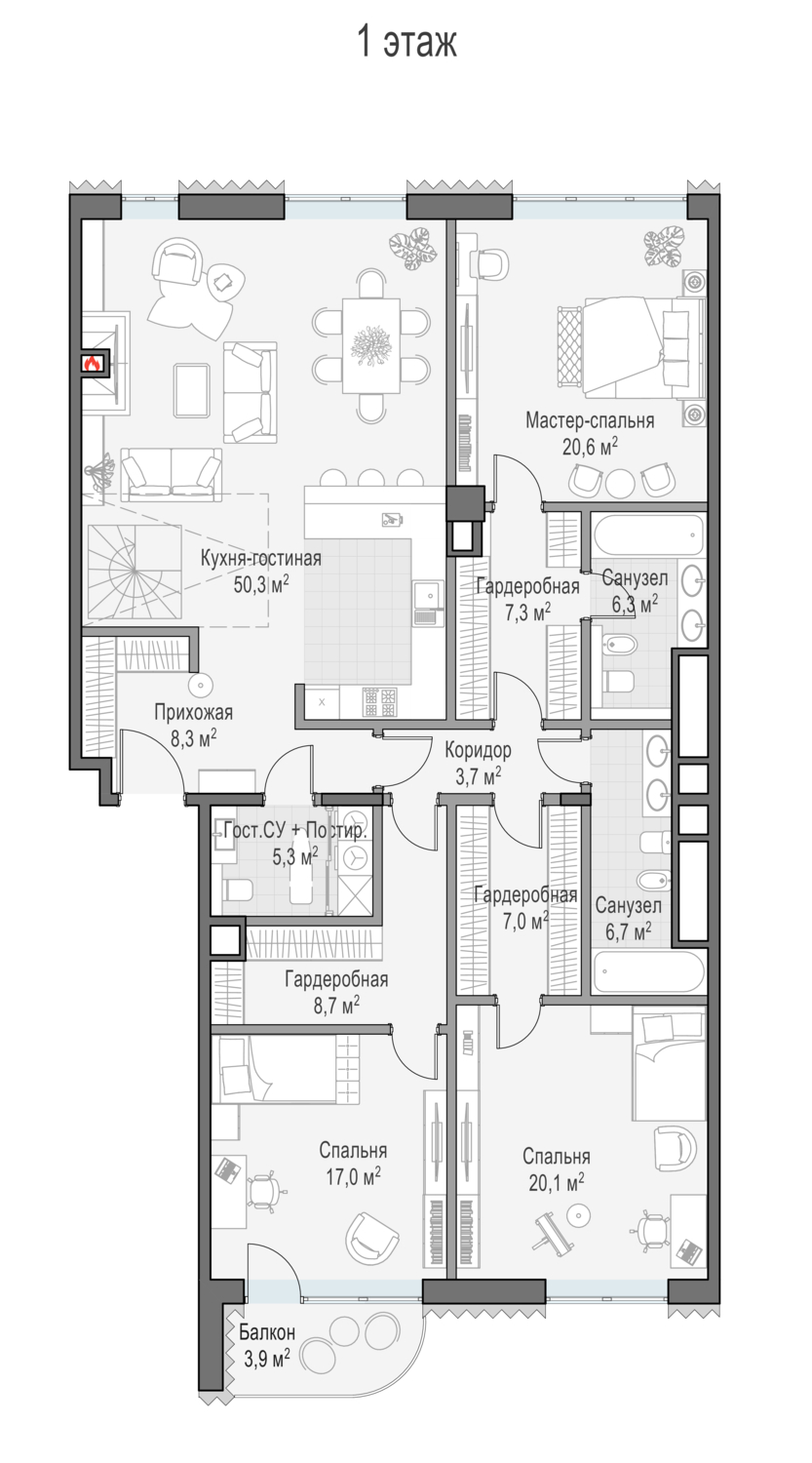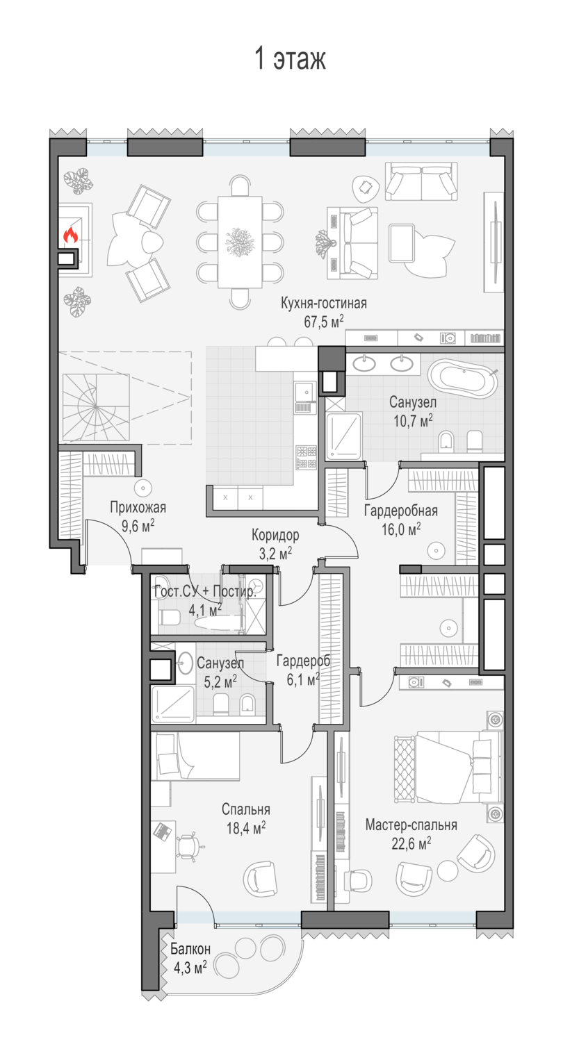 Просторный пентхаус с личной террасой площадью 163 кв. м. Из окон кухни-гостиной (67,5 кв. м) как на ладони открываются все «сто лиц» российской столицы: купеческие особняки Замоскворечья, створ Лаврушинского переулка, золотые купола Кремля и храма Христа Спасителя, сталинские высотки и небоскрёбы Москва-Сити, Марфо-Мариинская обитель. Большие панорамные окна и высокие 4-метровые потолки создают пространство, наполненное светом.