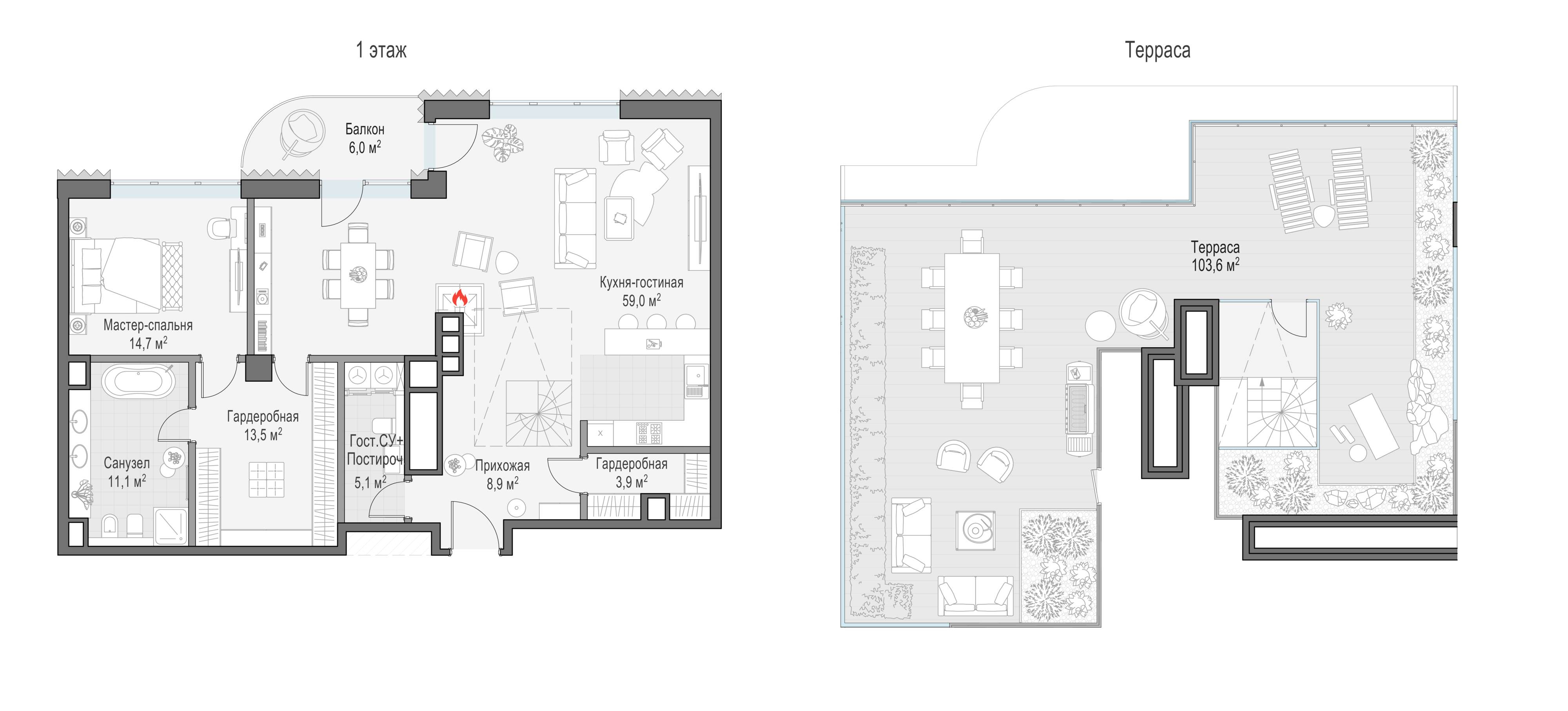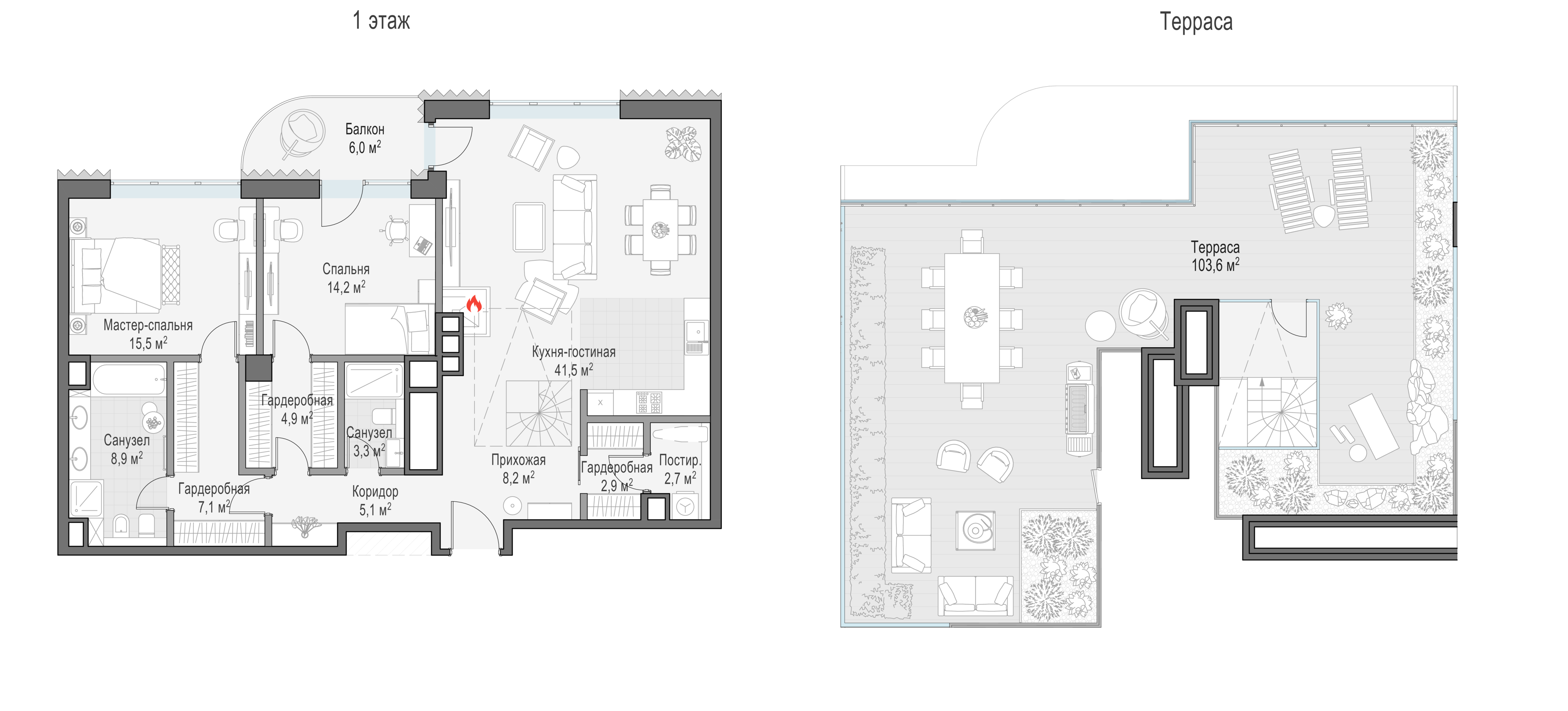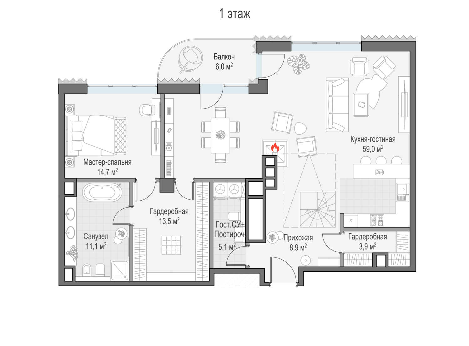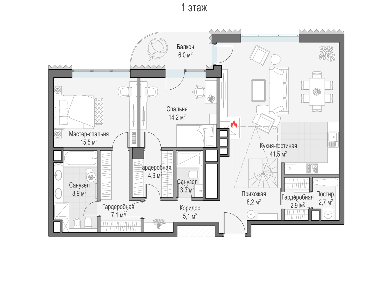 Просторный светлый пентхаус площадью 116 кв. м с террасой (113 кв. м). Из кухни-гостиной (59,1 кв. м) есть выход на балкон, а из мастер-спальни можно любоваться великолепным городом. Особенно прекрасен он в вечернее время, когда под звёздным небом подсвечиваются знаковые объекты столицы: Кремль, храм Христа Спасителя, створ Лаврушинского переулка