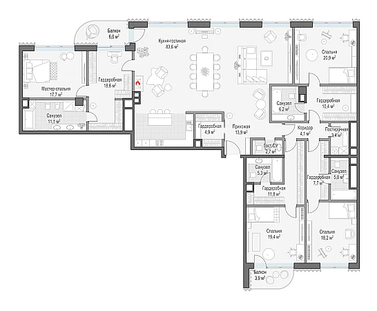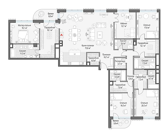 Просторная светлая квартира площадью 267 кв. м с высокими (3,51 метра) потолками. Спальни и кухня-гостиная (73,4 кв. м) отдалены друг от друга, большие панорамные окна и балконы выходят на противоположные стороны — северную и южную. Из квартиры открываются потрясающие виды на исторический центр столицы: створ Лаврушинского переулка, Кремль (один из главных атрибутов настоящего элитного дома), храм Христа Спасителя, Марфо-Мариинскую обитель. Ваши гости обязательно оценят эти неповторимые панорамы. В гостиной есть возможность установить настоящий дровяной камин.