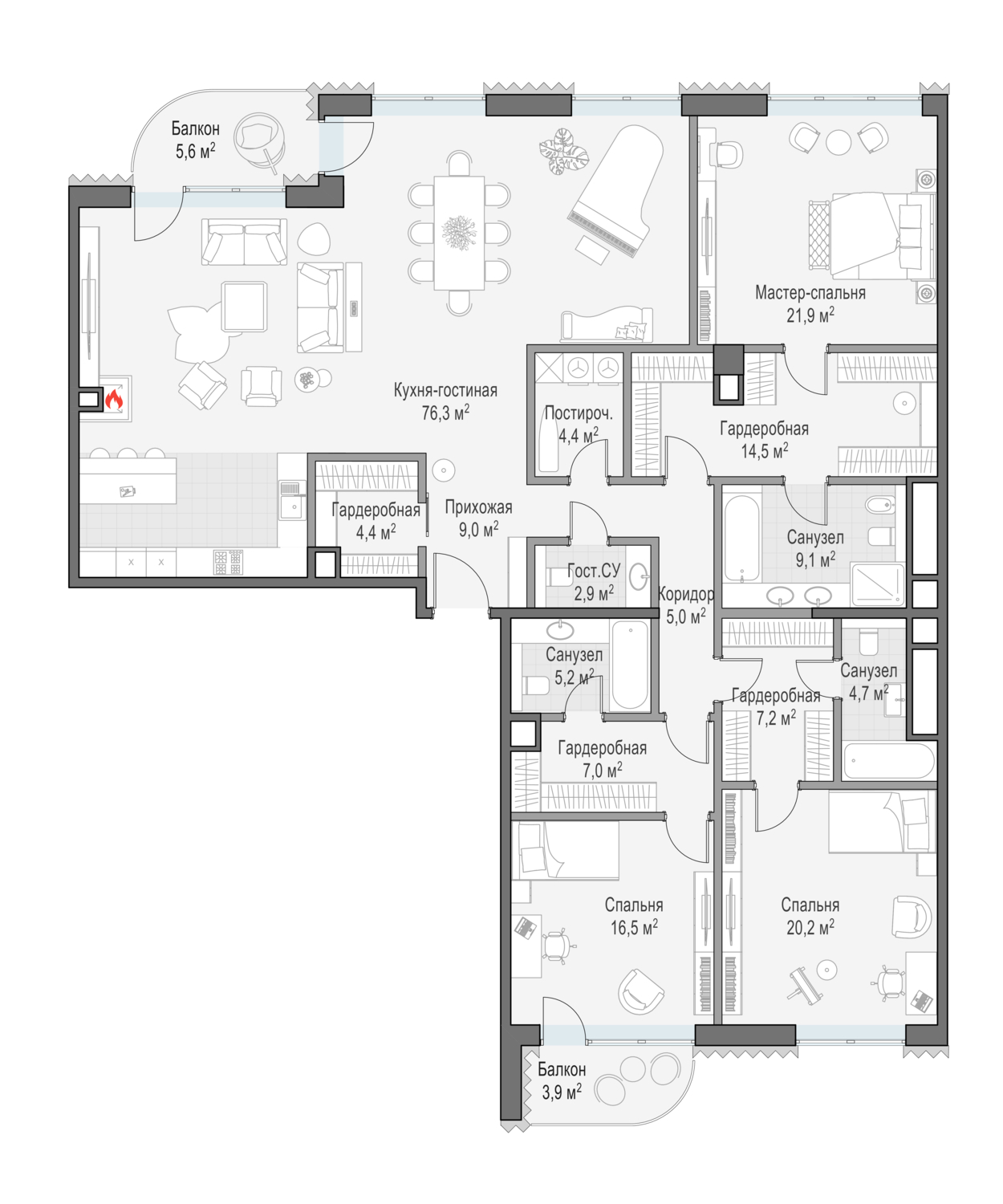 Просторная светлая квартира площадью 210 кв. м с высокими (3,51 метра) потолками. Спальные комнаты и кухня-гостиная (62 кв. м) отдалены друг от друга, их окна выходят на противоположные стороны — северную и южную. Из квартиры открываются неповторимые виды на исторический центр столицы: створ Лаврушинского переулка, Кремль, храм Христа Спасителя, Марфо-Мариинскую обитель, — а панорамное остекление улучшает видовые характеристики. В гостиной есть возможность установить настоящий дровяной камин.