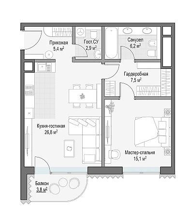 Квартира с одной спальной комнатой, обращённая окнами в зелёный благоустроенный двор-сад. К кухне-гостиной, которую лучше расположить сразу у входа, примыкает балкон, откуда особенно приятно любоваться оригинальным придомовым ландшафтом с вечерней подсветкой.