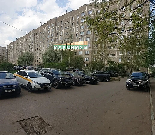 Во дворе дома современная детская площадка, удобная парковка для автомобилей.
