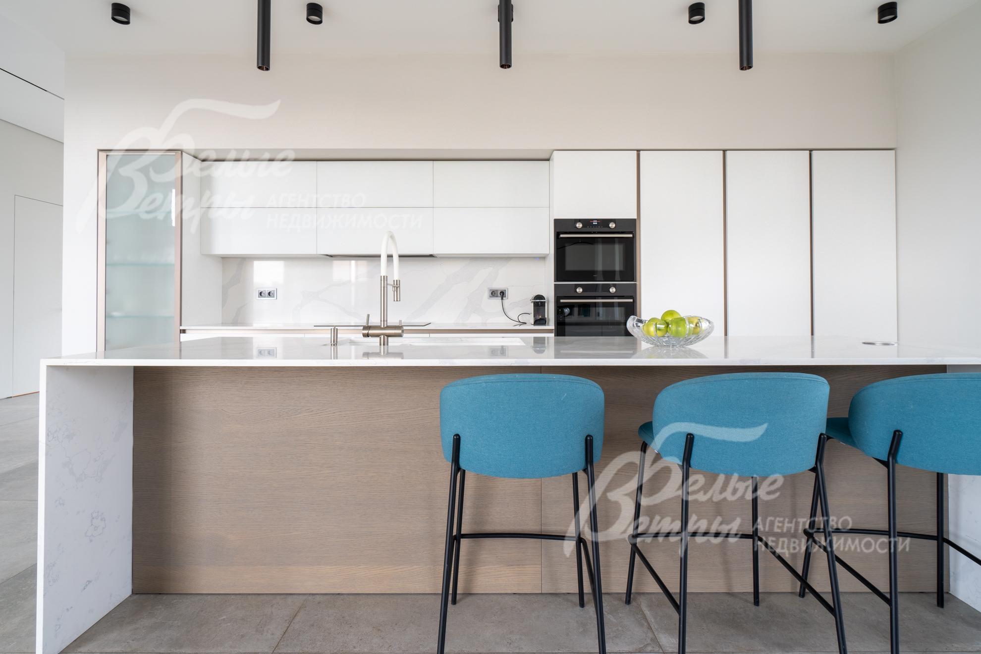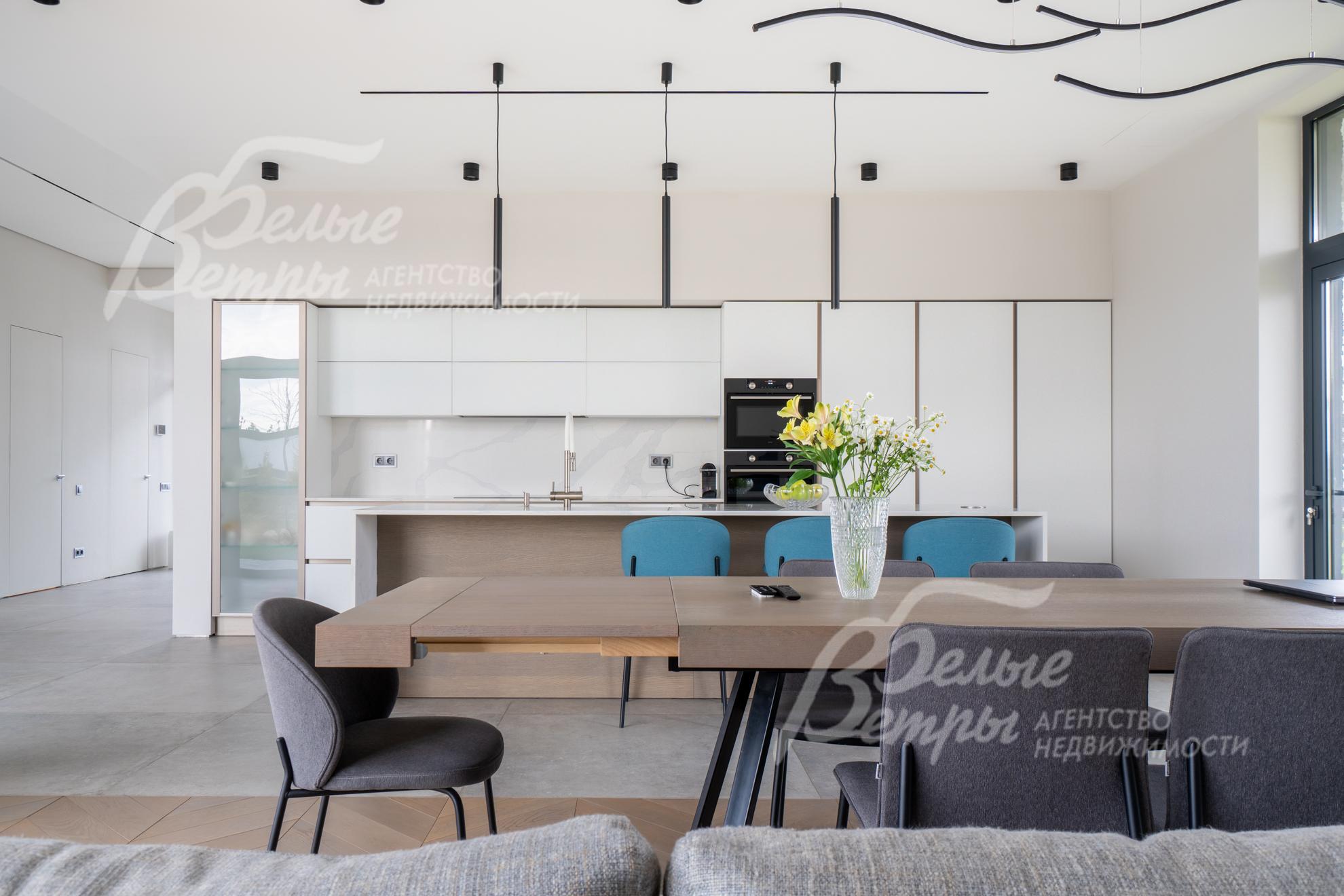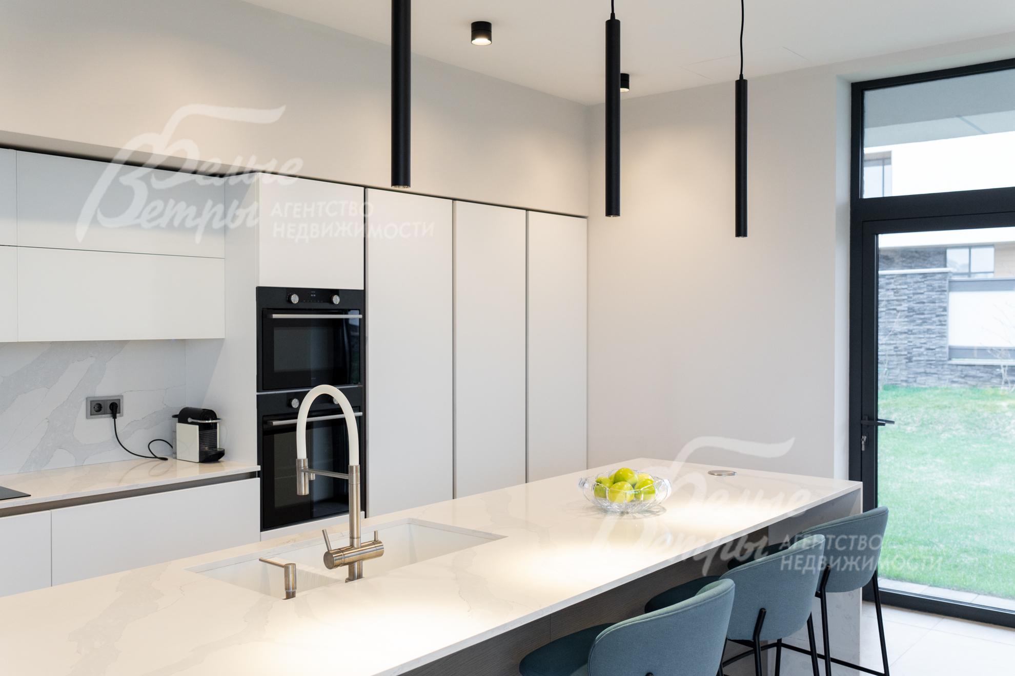 Мебель, оборудование: в гостиной – мягкая мебель DITRE (Италия), корпусная и столовая мебель BoConcept (Дания): раздвижной обеденный стол из шпона дуба и 6 стульев-кресел. Кухня LUBE (Италия) фасады -крашеный МДФ и матовое стекло, не оставляющее отпечатков, с фурнитурой BLUM; столешница из кварцевого агломерата; 3 полубарных стула; кухонный остров; встроенная техника ASKO: микроволновая печь, духовой шкаф, холодильник, индукционная плита, посудомоечная машина; вытяжка Faber (Италия) и вытяжная система над островом. В мастер-спальне – кровать, комод BoConcept (Дания). В санузлах: керамика Ceramica Nova (Италия), смесители HANSGROHE (Германия), мебель, выполненная по индивидуальному заказу, на втором этаже при мастер-спальне – раковины NOKEN PORCELANOSA (Испания), душевая система TIMO Selen (Финляндия); в другом санузле на втором этаже - ванна VILLEROYBOCH (Германия); в санузлах на втором этаже установлено стекло осветленное (Crystalvision, -Япония). В прачечной – техника ASKO: стиральная машина, сушильная машина. На участке есть садовая мебель..