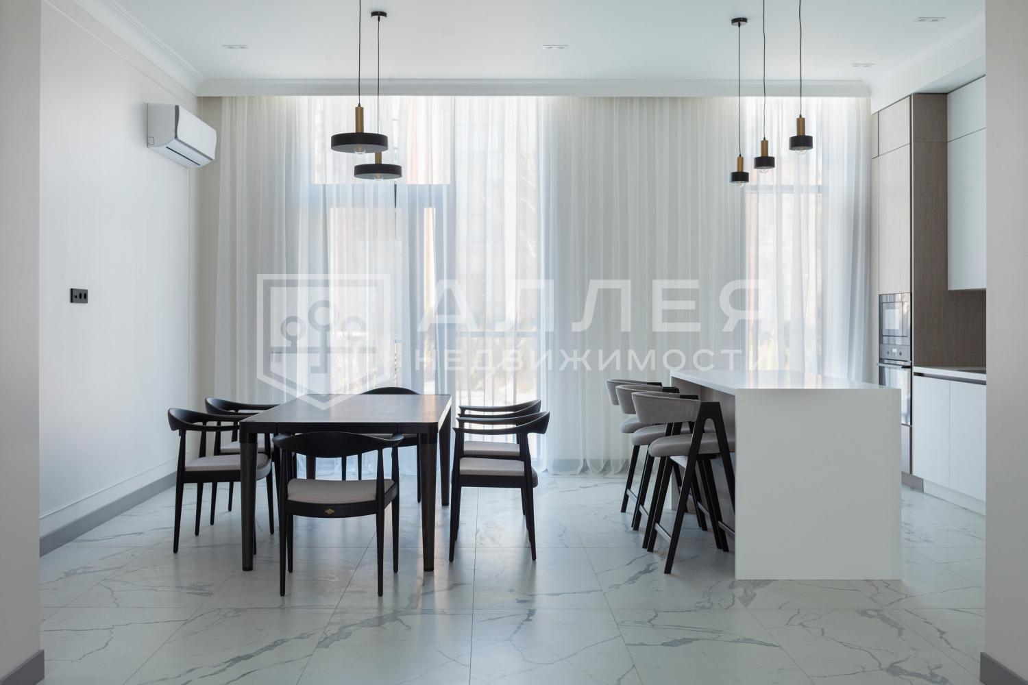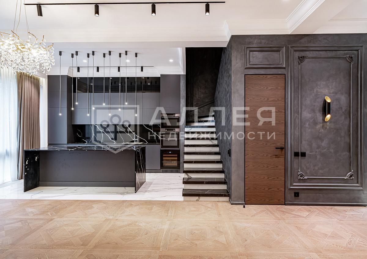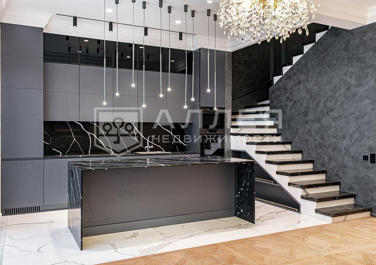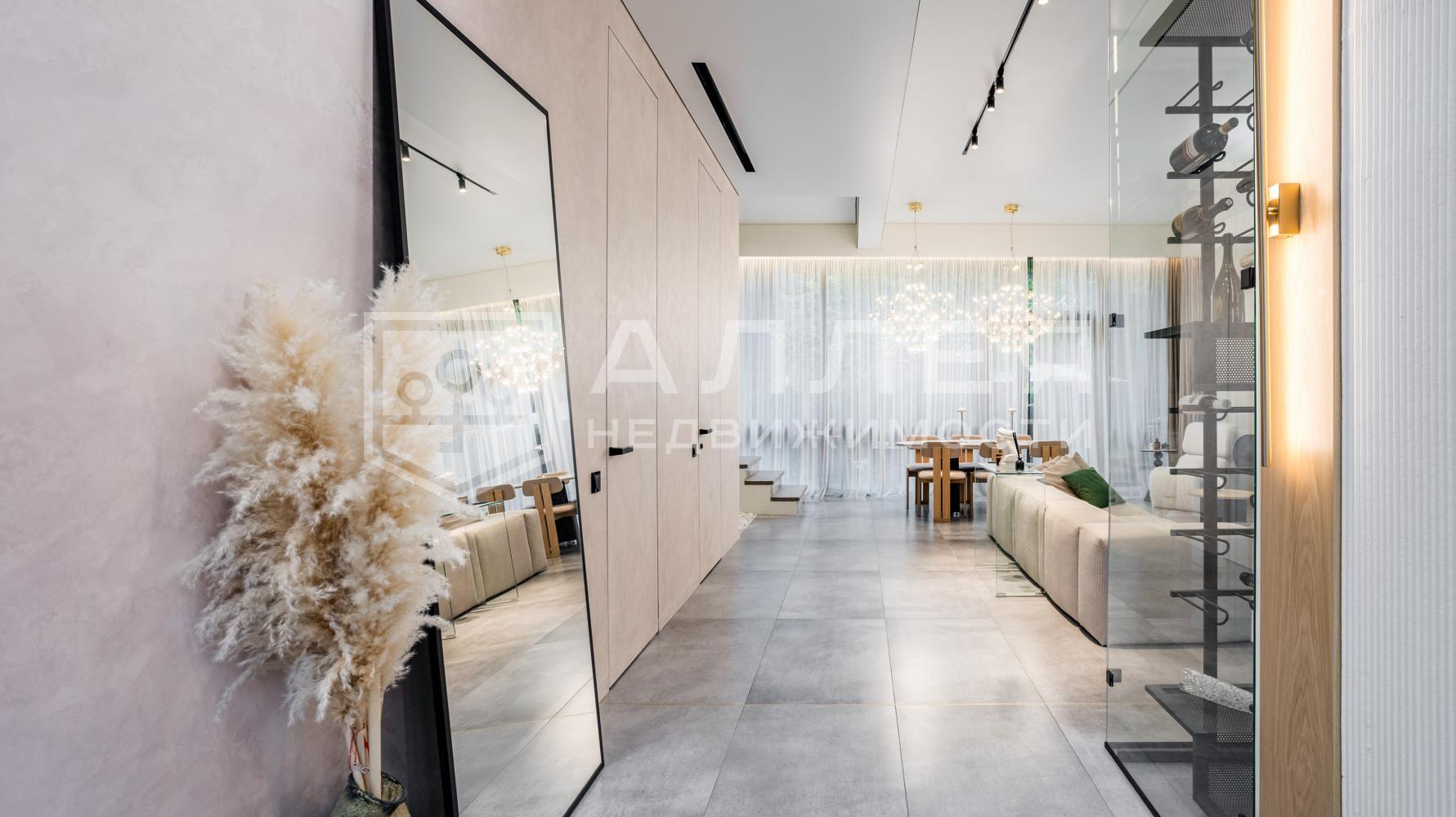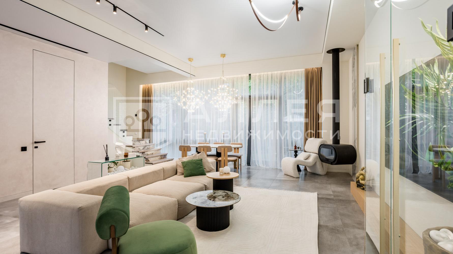 Современный четырехуровневый таунхаус с высокими потолками и продуманной планировкой. Дом меблирован, выполнен дизайнерский ремонт. В доме предусмотрена просторная терраса, гостиная с камином, 4 спальни с видами на посёлок.