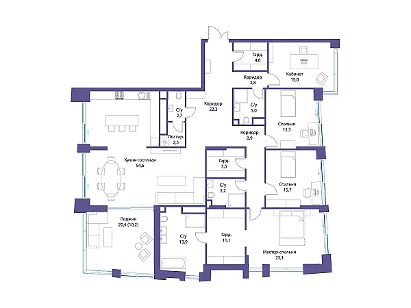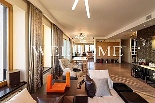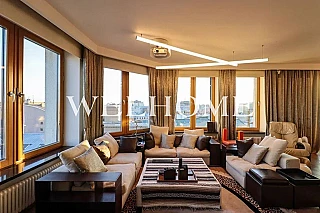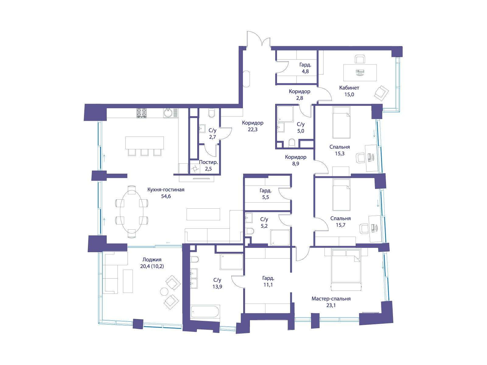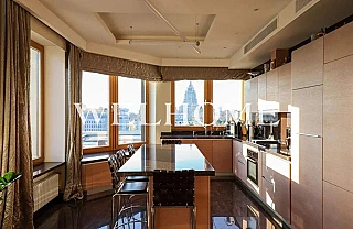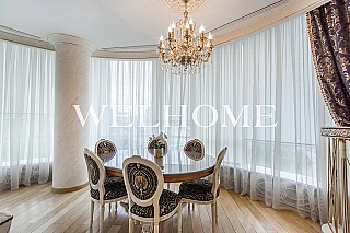 В квартире продуманная функциональная планировка с просторной кухней 54.60 м2. Жилая площадь - 89.50 м2. Высота потолка от 3,65 м. Изолированные комнаты, 4 санузла(1 раздельный и 3 совмещенных) . Окна на три стороны света. Виды на природный парк и реку.