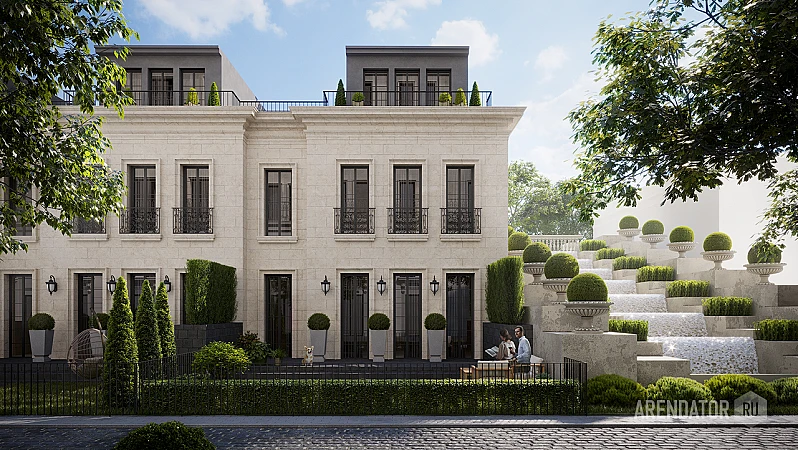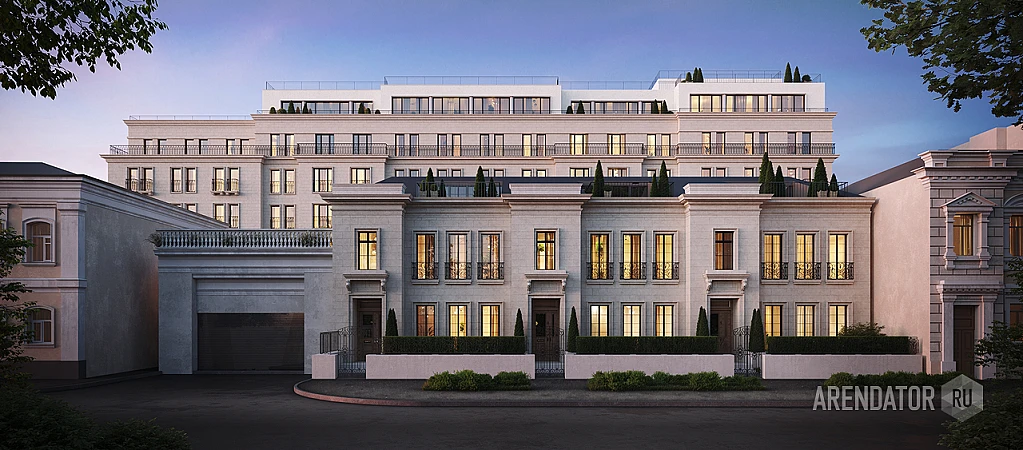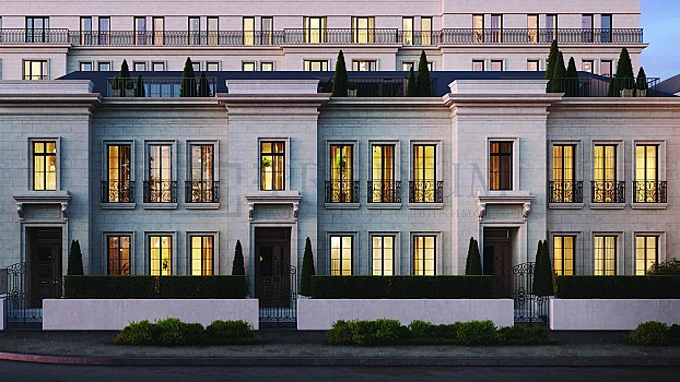 Представительский особняк в историческом Замоскворечье в Золотом квадрате Москвы (новое строительство). Утонченная роскошь фасадов из натурального камня, французская неоклассика на закрытой территории.
