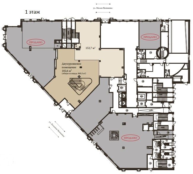 Витринные окна, отдельный вход с ул. Большая Якиманка, 2 обособленных прямых выхода из цоколя на ул. Малая Якиманка.