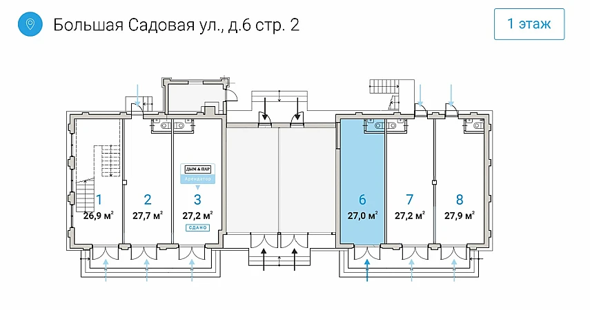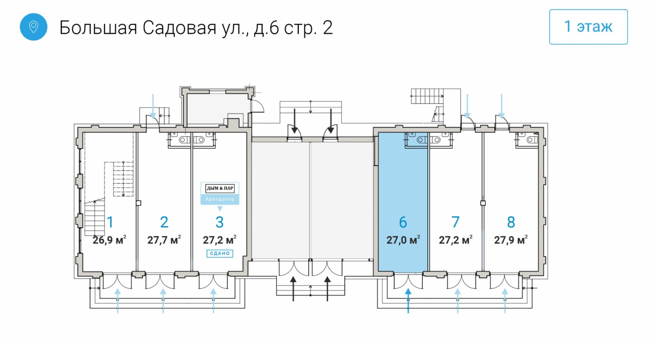 ПЛАТИМ АГЕНТАМ. Поможем с планом рассадки, ремонтом, мебелью. Торговый дом расположен недалеко от метро Маяковская, Пушкинская, Тверская. Интенсивный пешеходный и автомобильный трафик. Описание помещения: Два соседних блока, 6 и 7 - 27 м2 и 27,2 м2.