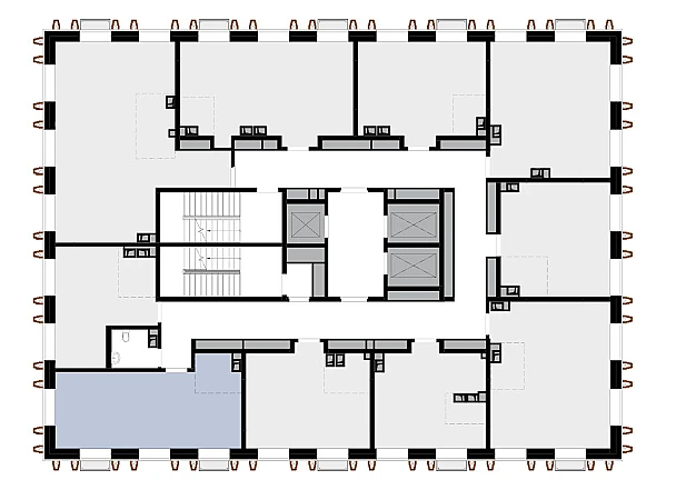 В стилобате размещаются торговые площади под магазины, рестораны, кафе. Будет организована зона коворкинга с разноуровневыми пространствами — от маленьких переговорных комнат до больших конференц-залов.