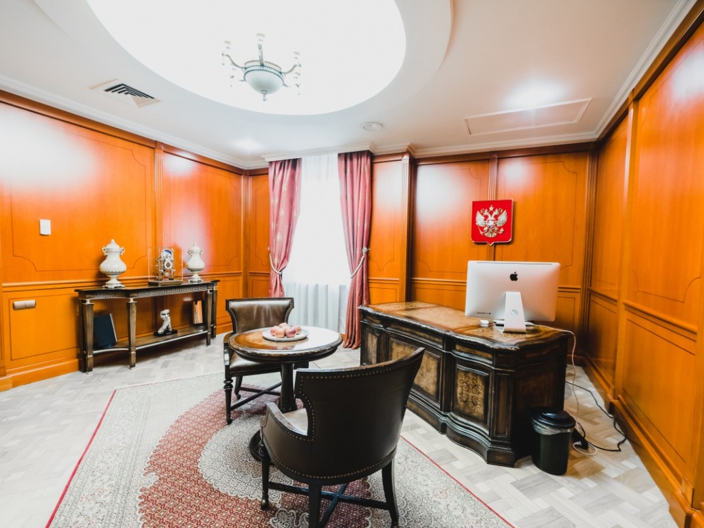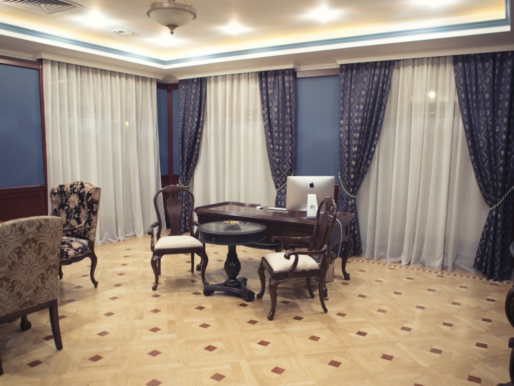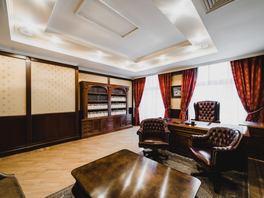 Офис полностью готов - весь ремонт сделан из дорогих заграничных материалов(полы-штучный паркет, мрамор, стены-обои из шелка и венецианка, в сан узлах электрические рукомойники немецкой фирмы, осушители рук немецкого производства,а так же немецкая сан техника).