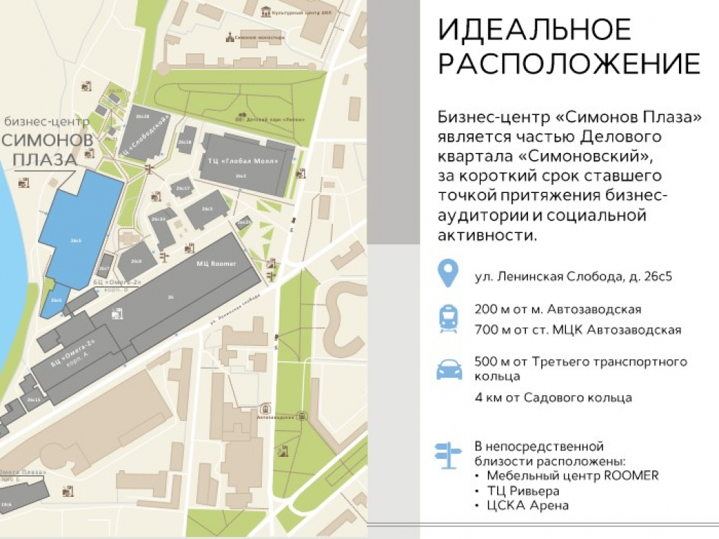 Здание расположено в 4 минутах пешком от станции метро Автозаводская. Удобный доступ на автомобиле – с обеих сторон