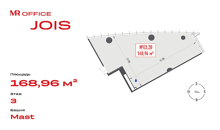 Предлагается офисное помещение 168.96 кв.м на 3 этаже БЦ Jois.