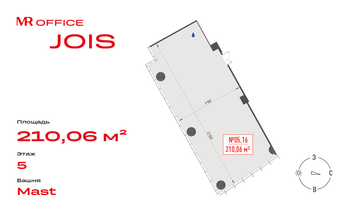 Предлагается офисное помещение 210.06 кв.м на 5 этаже БЦ Jois.