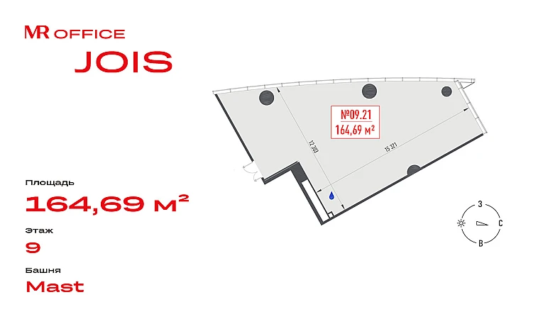Предлагается офисное помещение 164.69 кв.м на 9 этаже БЦ Jois.