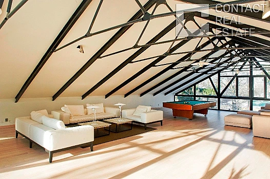 1-ый этаж: основной дом: крыльцо 30 кв.м, прихожая 4 кв.м, холл 38,5 кв.м с гардеробной 6 кв.м, гостиная со вторым светом 63 кв.м, столовая 30 кв.м с выходом на террасу, каминная 30 кв.м с выходом на террасу, кухня 30 кв.м, спальня 31 кв.м с санузлом 20 кв.м, кладовая при кухне 29 кв.м, терраса 50 кв.м