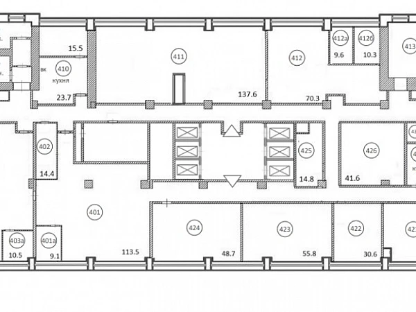 Предусмотрены переговорные, кухня и зона столовой, кабинеты и многообразные рабочие пространства.
