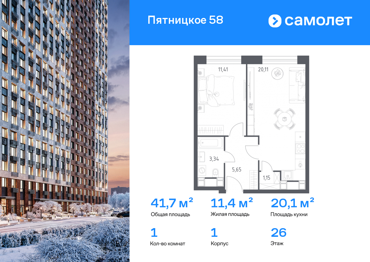 Строим кварталы для жизни с заботой о будущем. Предлагаются 1-комнатные апартаменты комфорт-класса 41,66 кв.м в корпусе 1 на 26 этаже, в ЖК «Пятницкое 58»