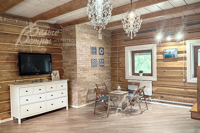 Уютный бревенчатый дом с мебелью, со всеми коммуникациями, на отдельном благоустроенном участке, в охраняемом камерном мини-поселке, расположенном на опушке леса, в излучине р. Моча.