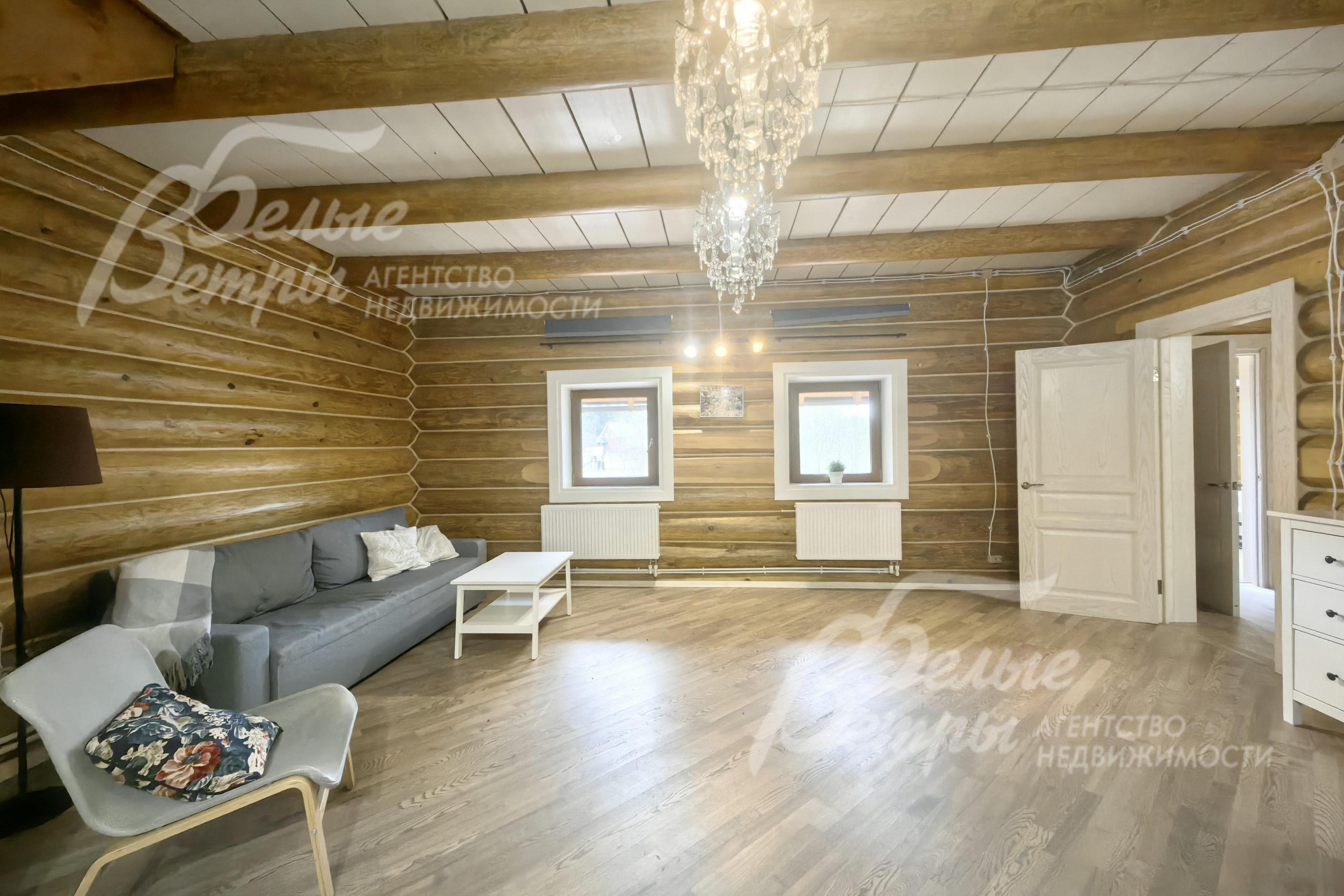 Внутренняя отделка: отделка в современном стиле минимализма: стены бревенчатые, окрашены; в санузлах плитка; на полах ламинат, в гостиной и в цокольном этаже - плитка; потолки отделаны деревом. Лестница шириной 90 см из массива сосны с деревянными перилами..