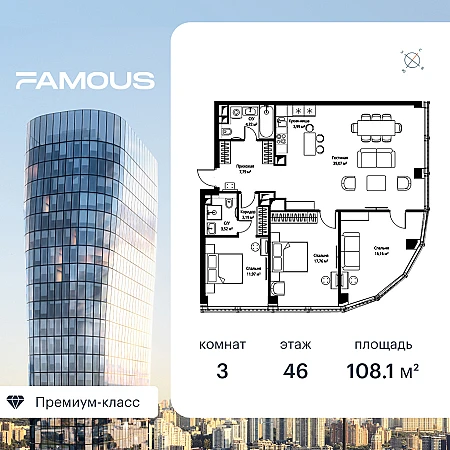 Продаётся 3-к квартира общей площадью 108.17 кв. м с предчистовой отделкой на 46-м этаже премиального небоскреба Famous.