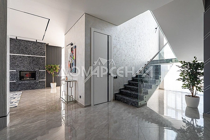 • Удобная железобетонная лестница с отделкой из натурального мрамора и стеклянным ограждением, по дому разведен встраиваемый пылесос
