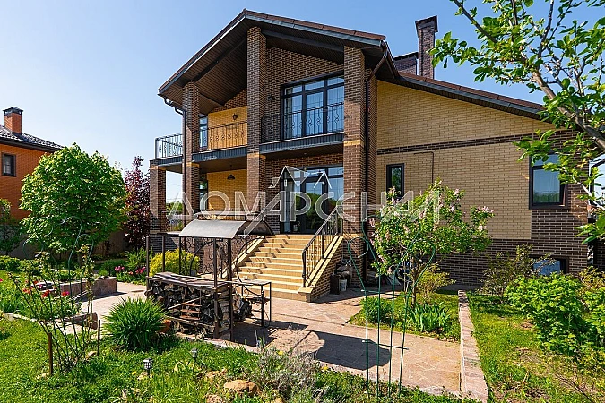 Ландшафтный дизайн премиум-класса! Плодовые деревья и кустарники, изысканный розарий, цветущие и декоративные растения. Ваше украшение – красный клен и розовый каштан. Навес на 3 авто, парковка, дорожки и отмостка из натурального камня Ламизит.