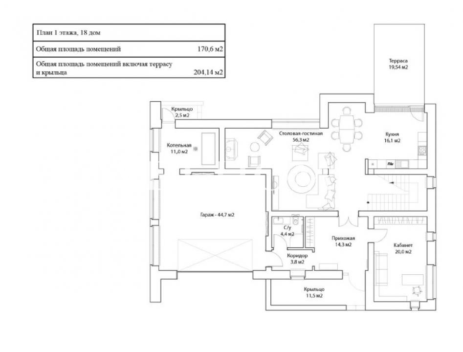 1 этаж: холл, гостиная-столовая, кухня, кабинет, котельная, с/у, гараж на 2 м/м;