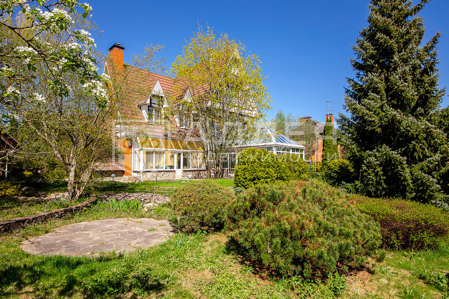 Участок абсолютно приватный - соседей не видно совсем. Он буквально утопает в зелени - растет много хвойных и лиственных деревьев и кустарников. Сделан ландшафтный дизайн, дорожки вымощены брусчаткой, есть декоративное озеро с водопадом. Построена дровяная баня с беседкой. Из бассейна сделан удобный выход на участок для отдыха летом. В беседке зона барбекю с печью и мангалом, заведены все коммуникации. Есть гараж на несколько автомобилей. Перед домом детская площадка. Здесь много места для комфортного отдыха