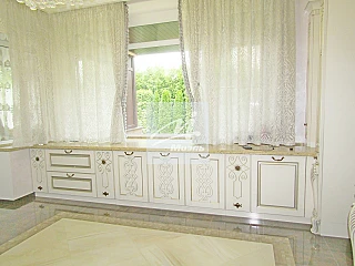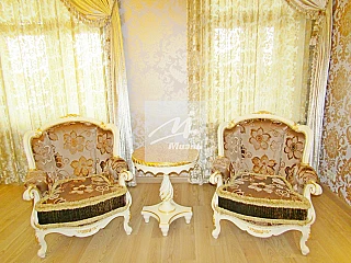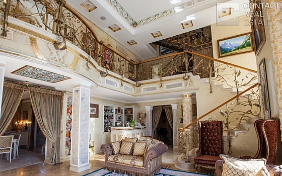 Предлагается великолепная резиденция, выполненная в классическом стиле , общей площадью 1200 м2 с отдельно стоящим зданием гаража с квартирой для персонала 200м2. Внешний фасад дома выполнен из натурального песчаника, украшен мозаичными панно, материал крыши - медь, окна- витражи. Во внутренней отделке использованы дорогие материалы : дуб, мрамор; ограждение лестниц и люстры из бронзы. В доме установлена система кондиционирования и вентиляции. Дом состоит из 2-х полноценных домов связанных между собой.