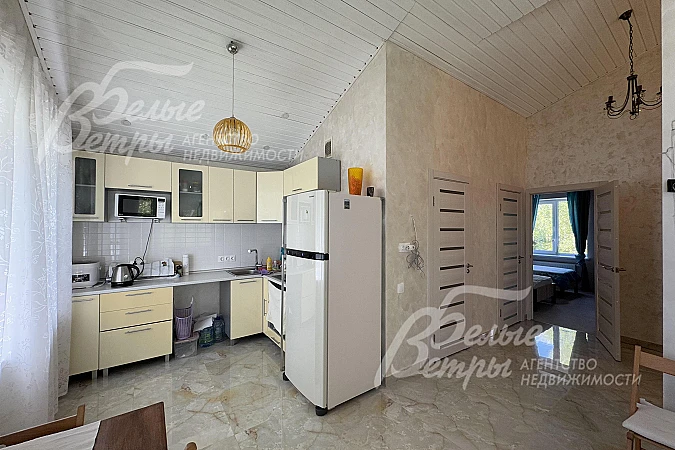 Кирпичный дом с отделкой под ключ в живописном месте, на второй линии от Елизаровского пруда. Дом стоит на просторном зелёном участке (12 соток): ровный рельеф гармонично дополняют сохранённые лесные деревья, ели и берёзы. В доме компактная практичная планировка с двумя спальнями и объединённым пространством кухни-гостиной. Есть готовый проект для расширения площади дома. Внутреннее оформление помещений в светло-бежевых тонах, частично дополненное мебелью. Дом находится в закрытом коттеджном посёлке со спортивной и детской площадками на второй линии от песчаного берега озера. Невысокие поселковые платежи. Московская прописка.